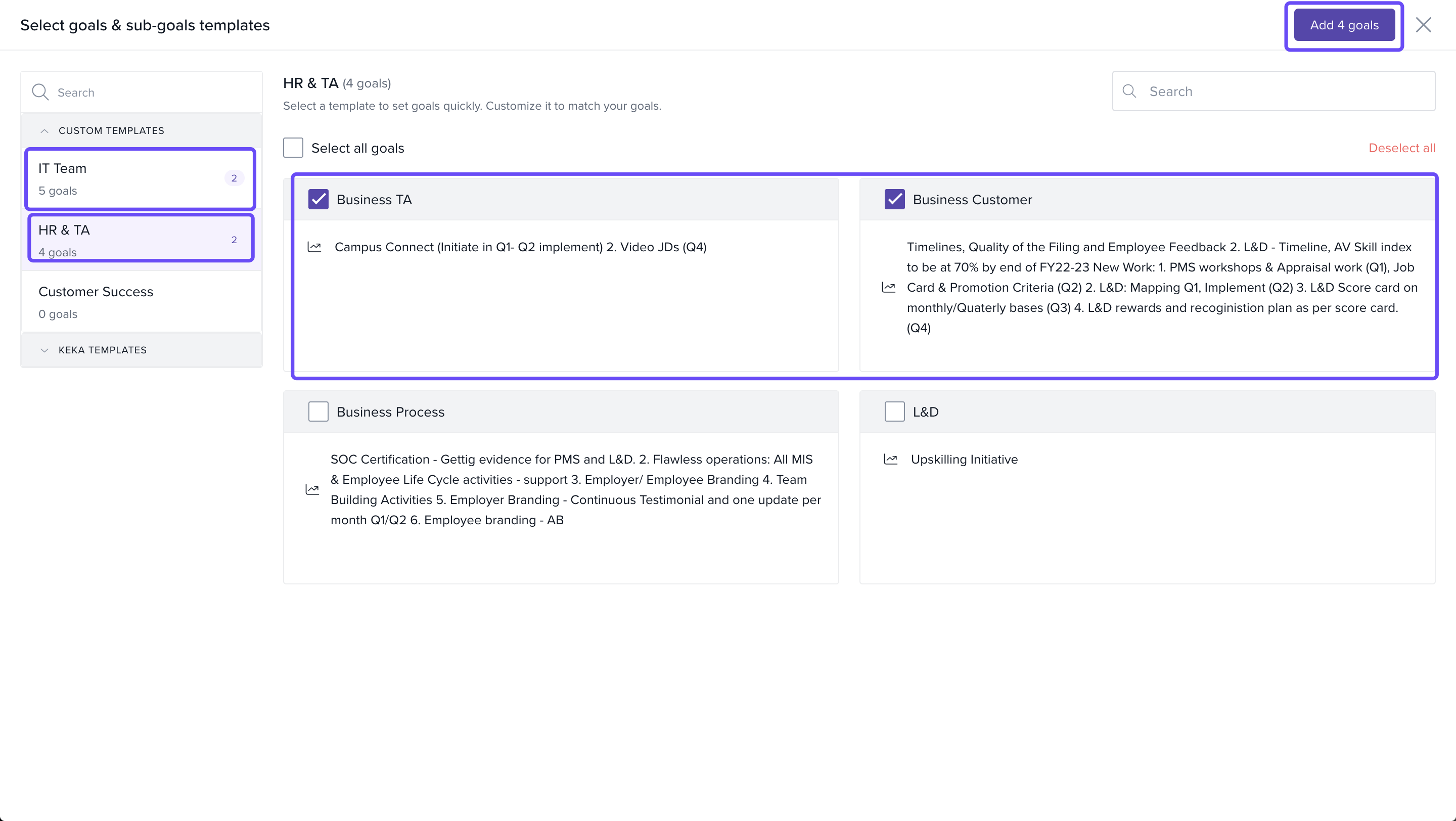 Whether you're working on OKRs, KPIs, or department-specific objectives, this feature helps you scale goal management while keeping everything aligned and actionable. Keka now makes it easier than ever to assign multiple structured goals in one go using pre-defined templates — saving time and ensuring consistency across teams.