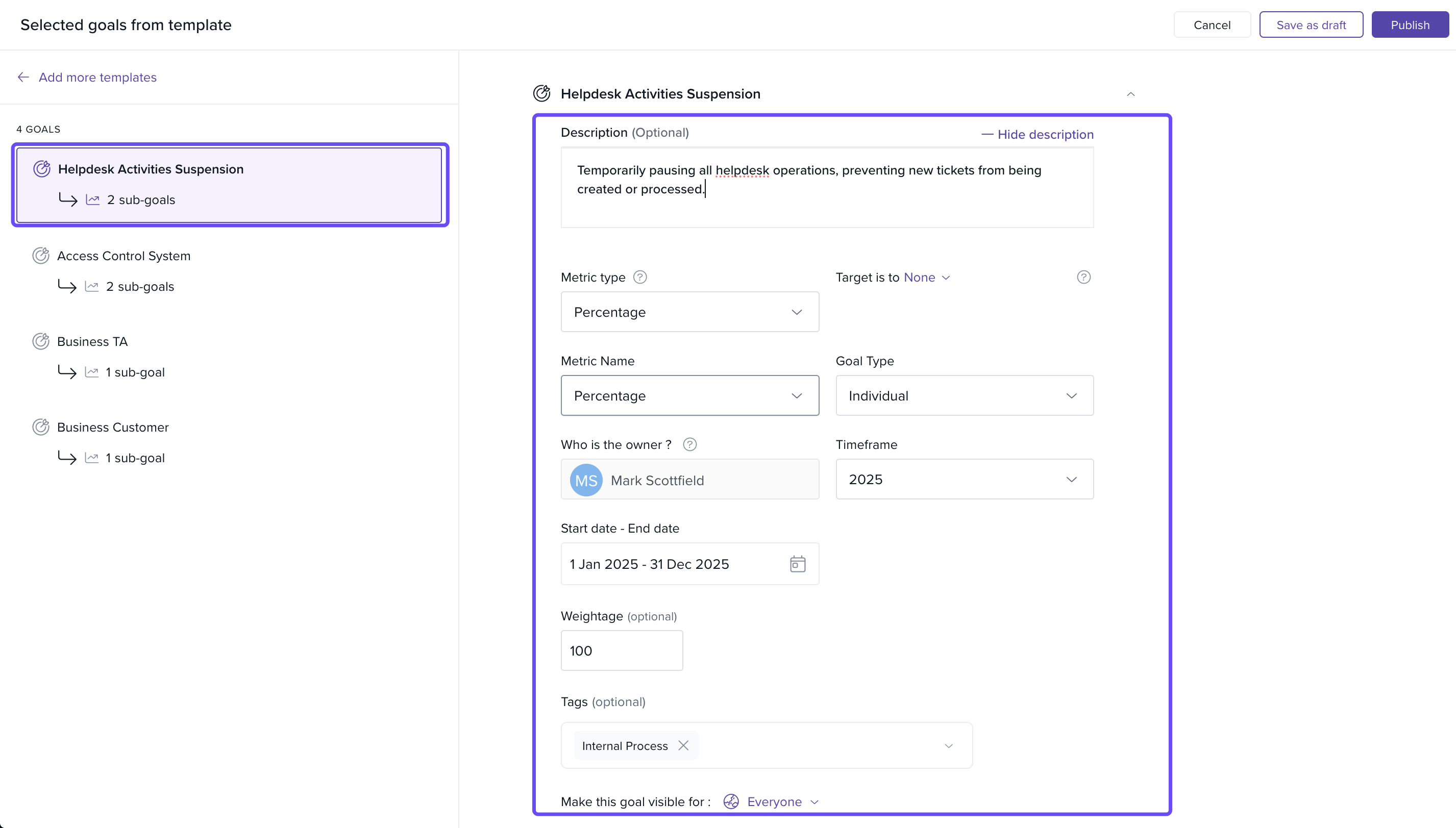 Optionally, customise goal details such as the title, metrics, and targets before finalising.