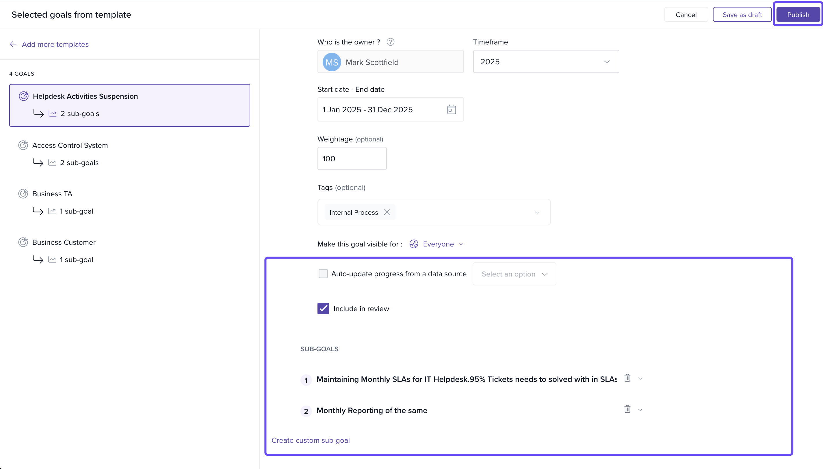 Once you are done with customising all the goal details, click on Publish.