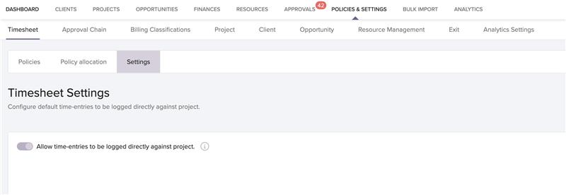 Navigate to Policies & Settings >> Timesheet >> Settings. Toggle the setting for Project-level time entries
