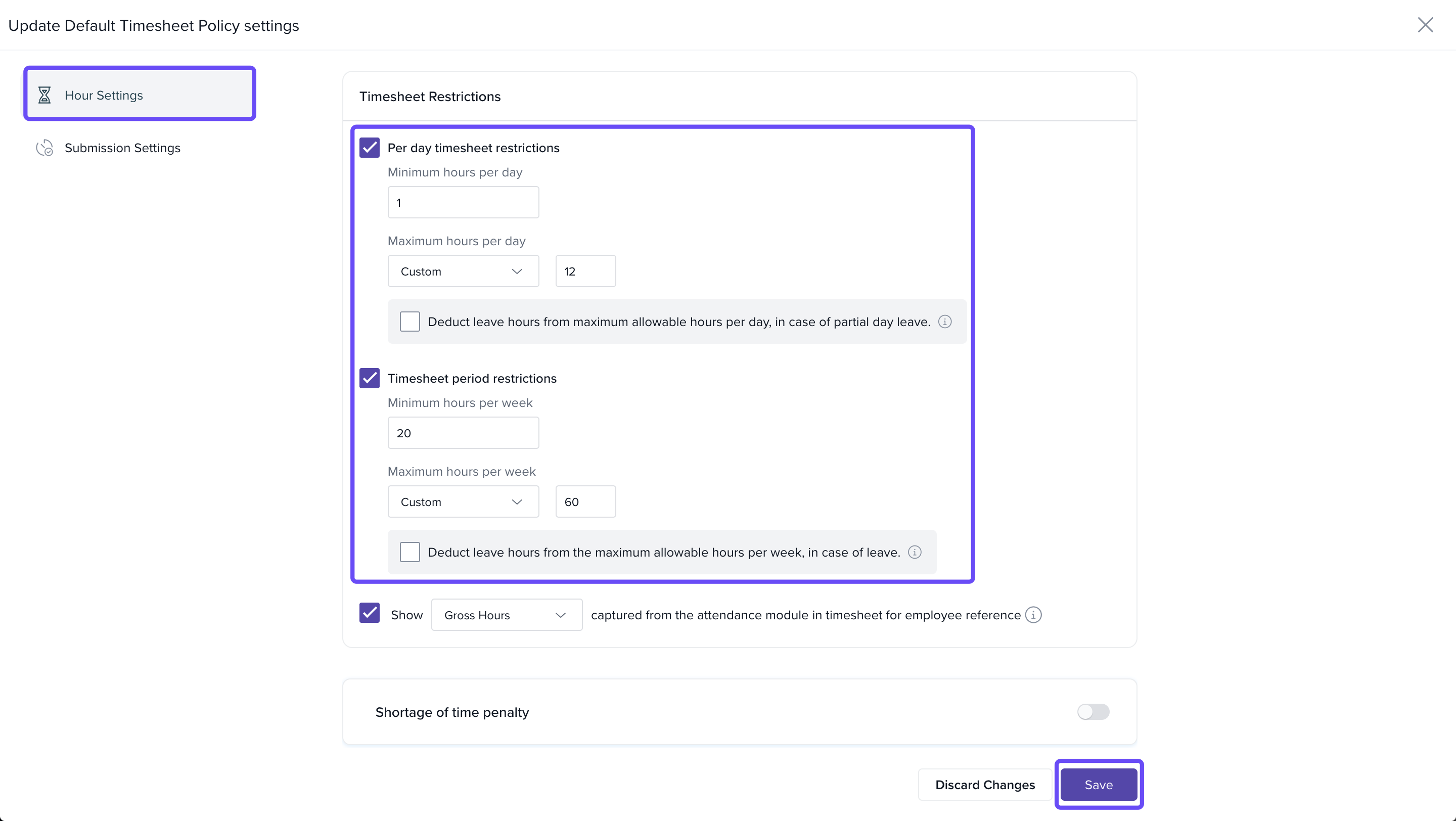 - In the Hour Settings section, set the Minimum and Maximum hours allowed for daily and weekly entries.