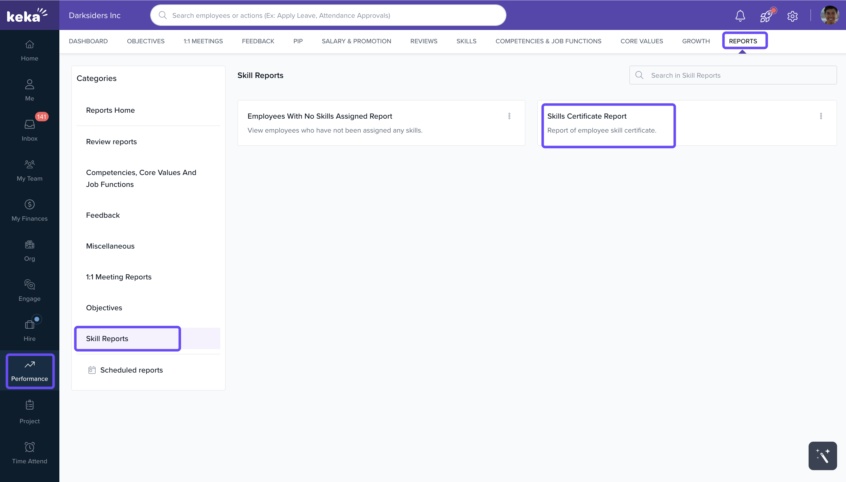 Navigate to the Performance section and select Reports. From the categories listed, choose Skill Reports, then click on the Skills Certificate Report.