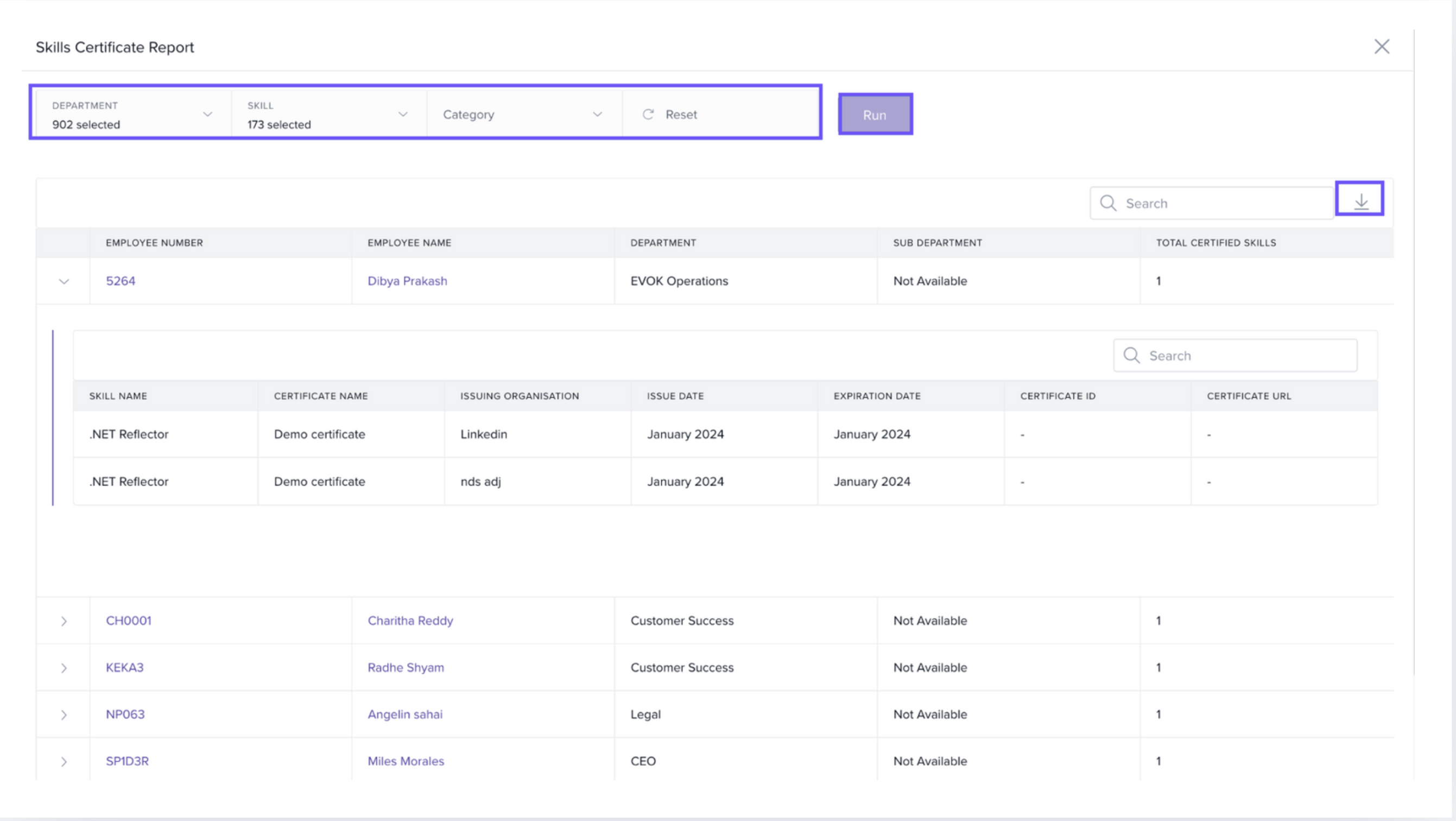 The Skill-wise Certificate Report gives you a consolidated view of all certificates submitted by employees for their assigned skills. It includes:
