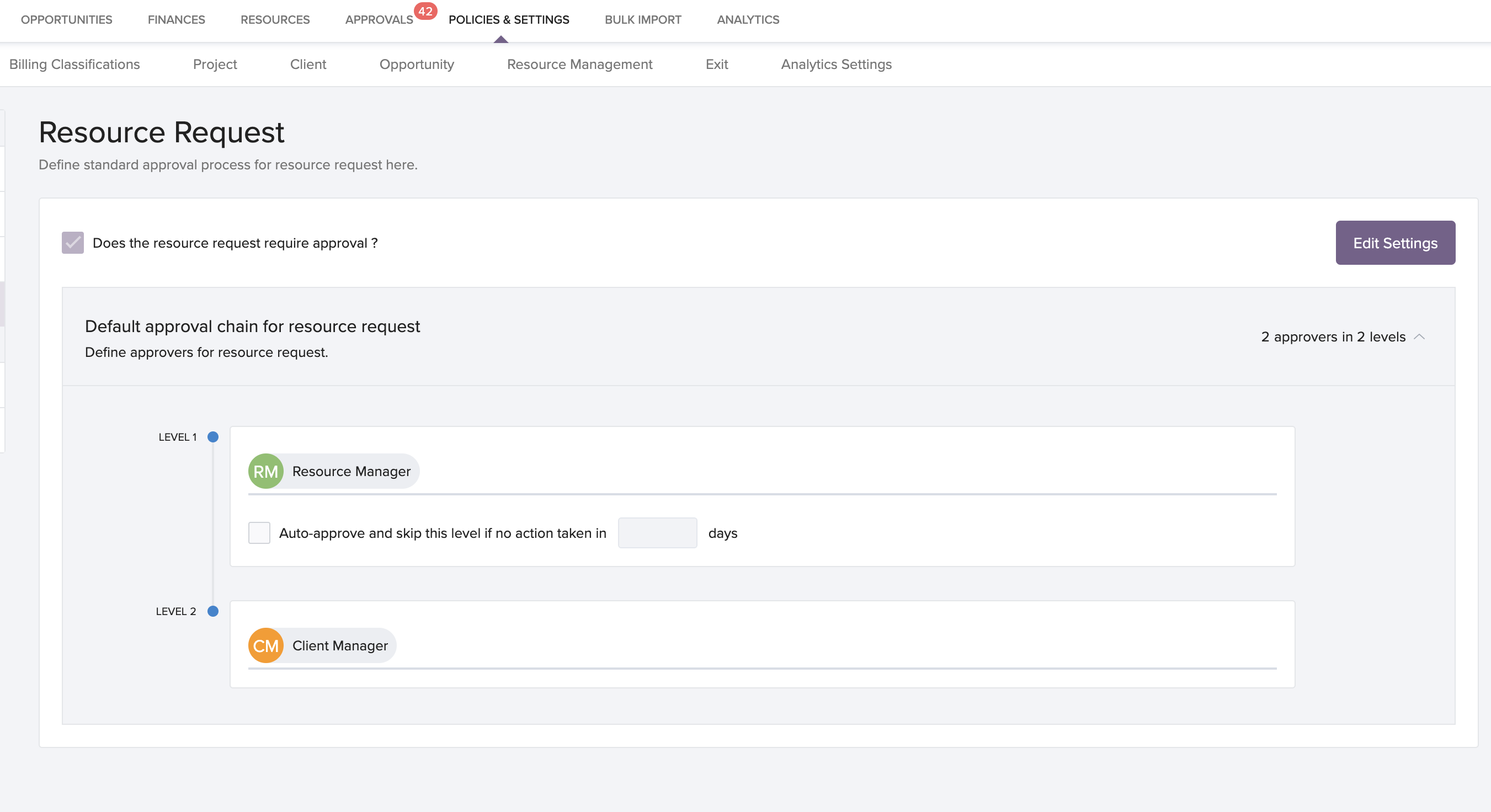 To set up approval process: Go to Policies and Settings >> Approval Chain >> Resource Request.