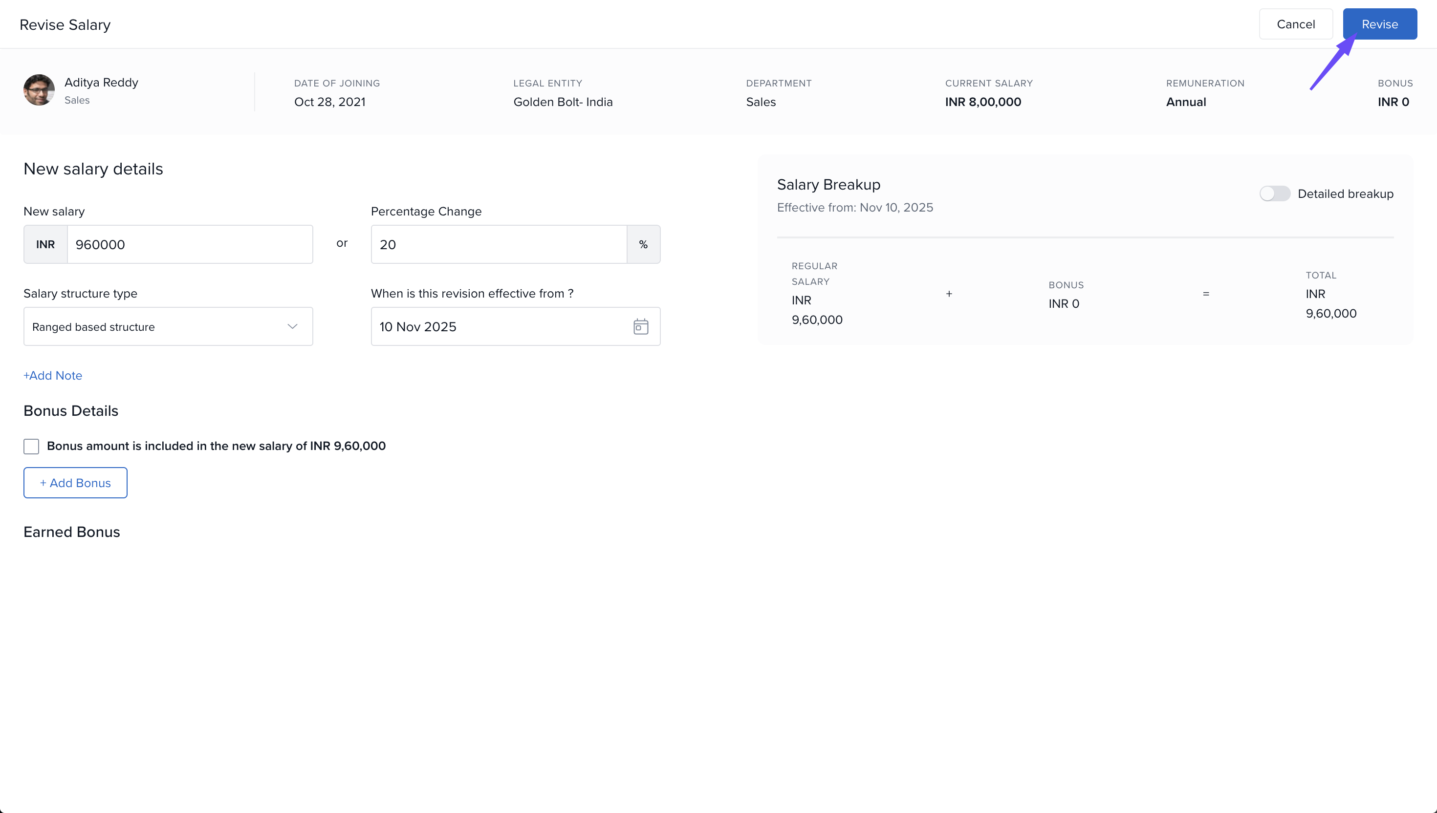 Once saved, the updated salary details are reflected in payroll and audit records automatically.