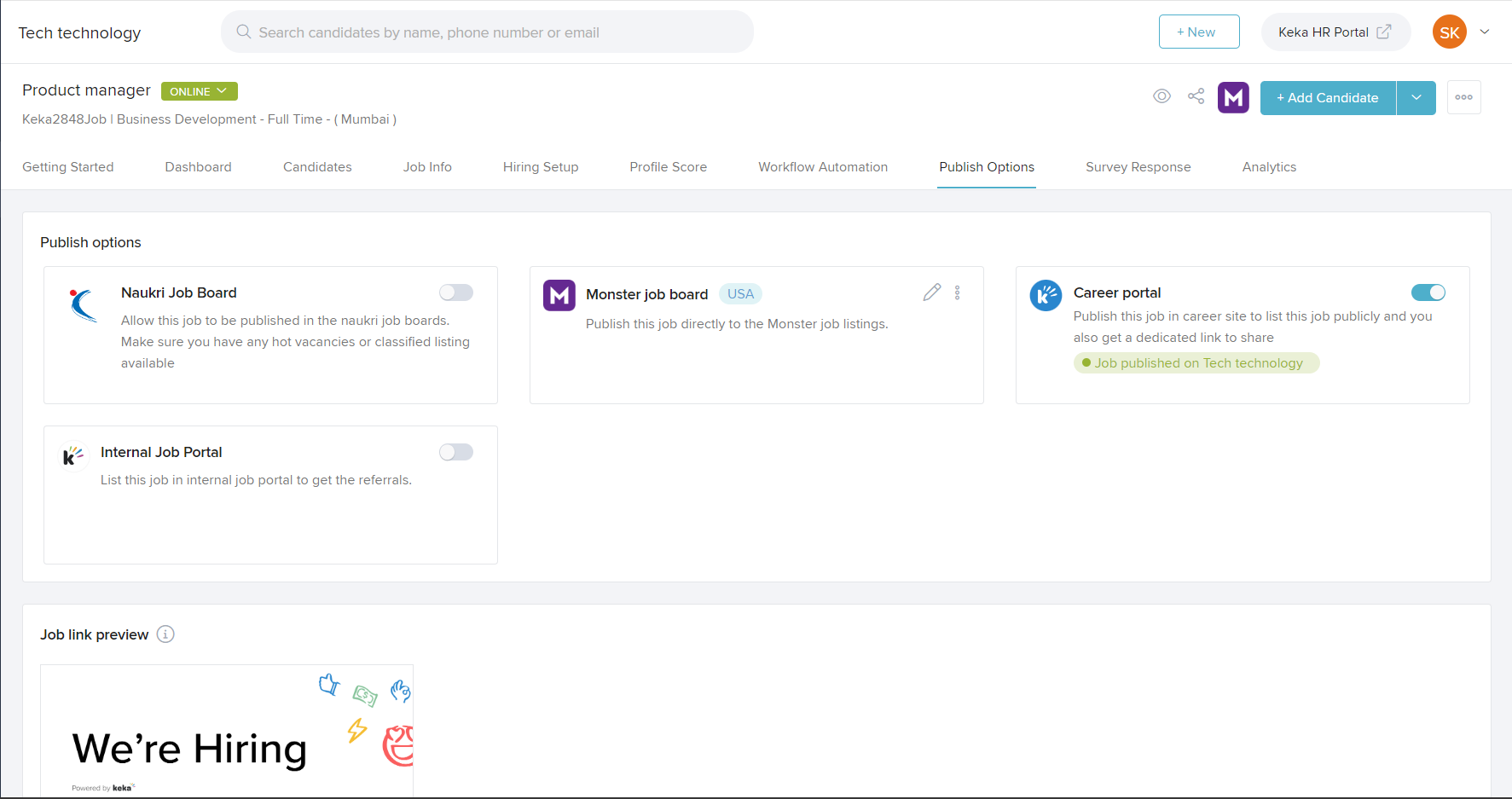 This article explains how U.S.-based recruiters can publish job openings from Keka Hire directly to Monster Jobs USA. You’ll expand your reach on a leading U.S. job board while keeping candidates on your own career portal.