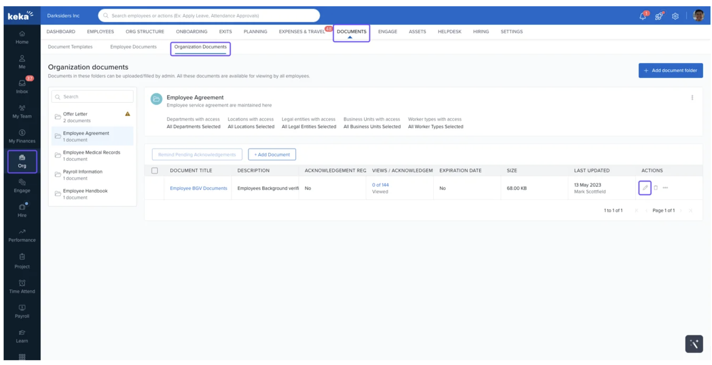 The Expiry Settings for Organization Documents feature provides a seamless way to track and manage document expiration dates in Keka. With this update, users can set expiry dates, receive timely reminders, and take action before documents expire, ensuring better compliance and document management.