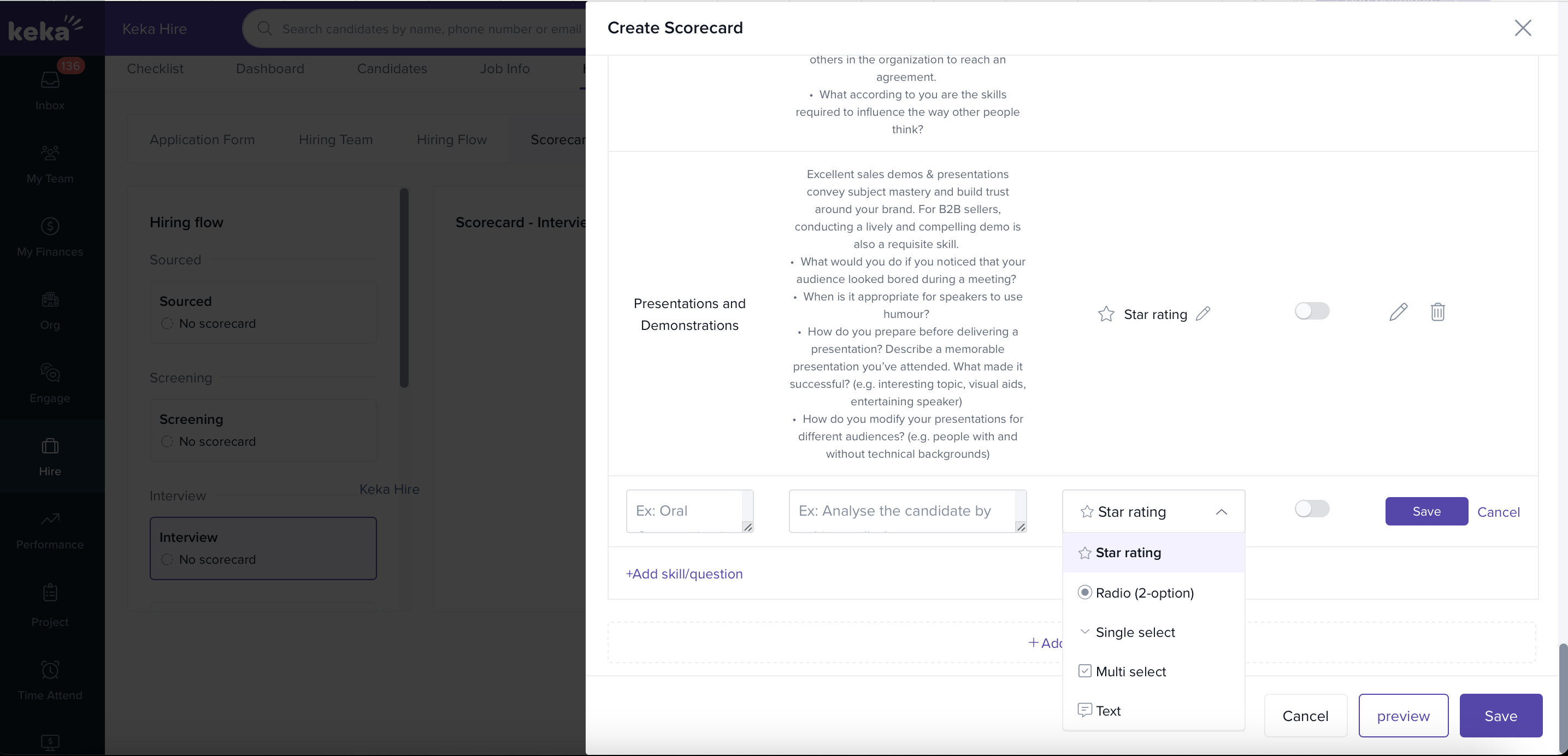 Recruiters and Hiring Managers can now customize how interviewers provide feedback using five flexible response types in scorecards. In addition to the existing star-rating system, you can now choose from radio buttons, dropdowns, or a comment-only format—helping capture both quantitative and qualitative feedback during interviews.