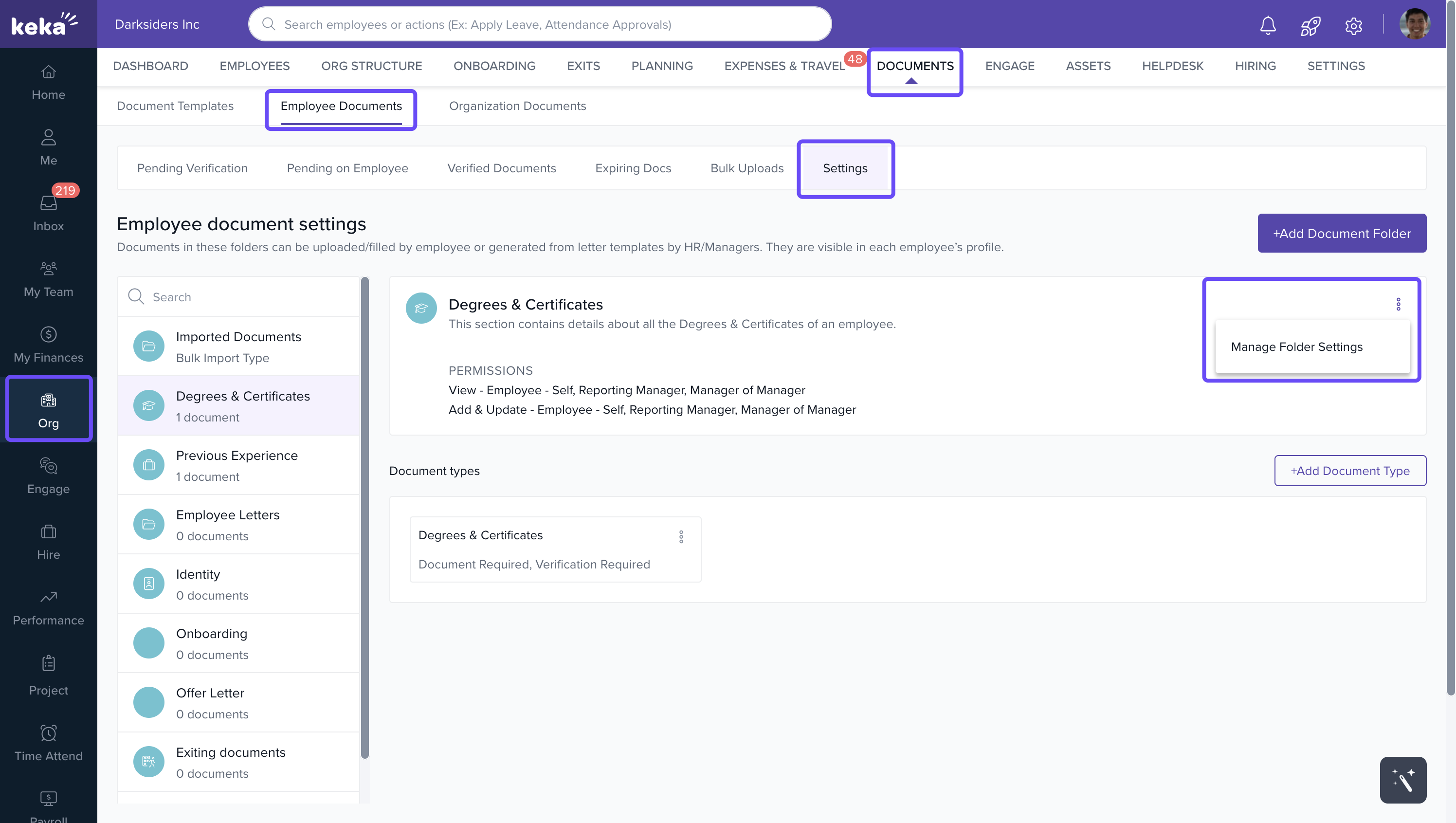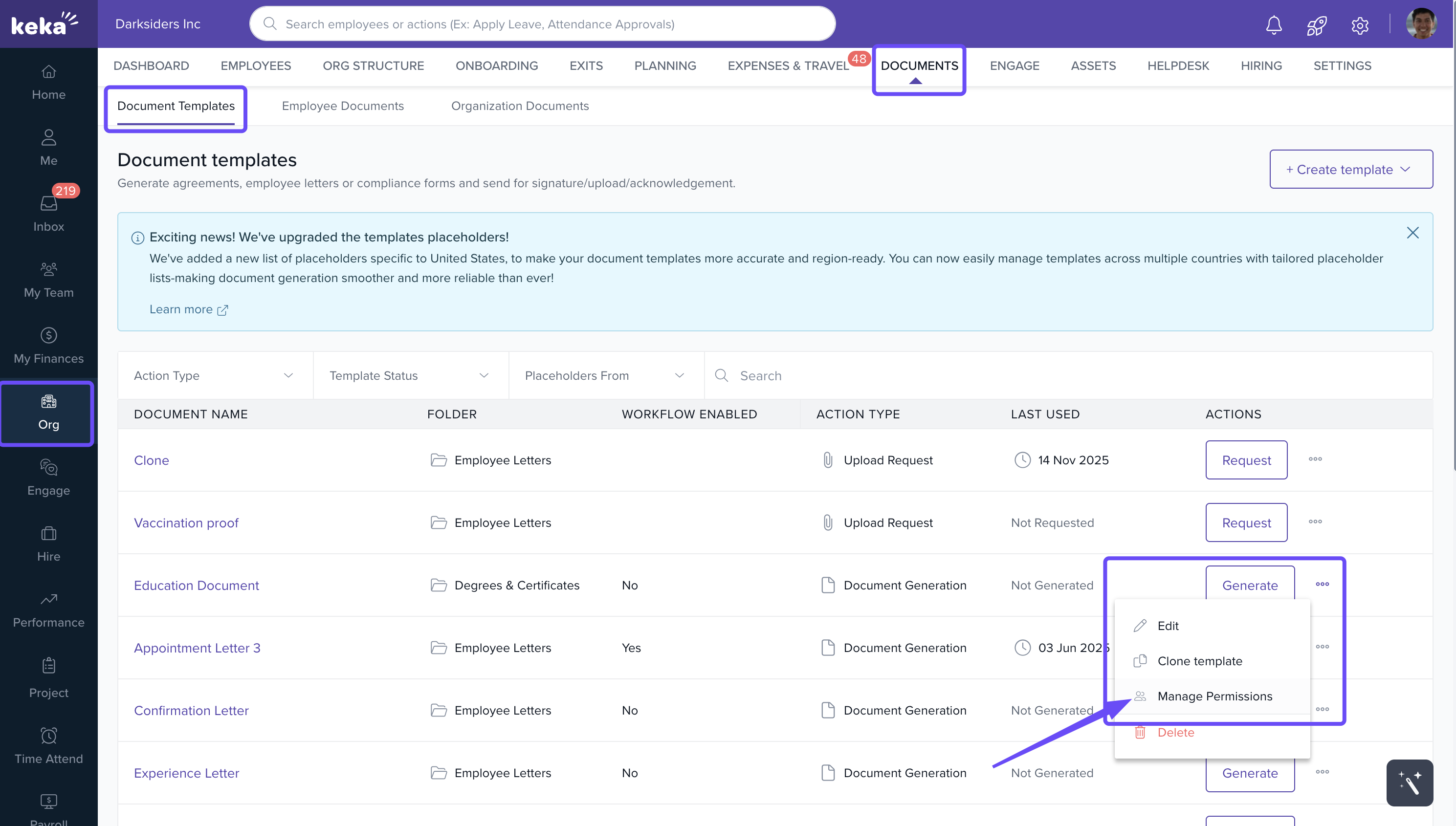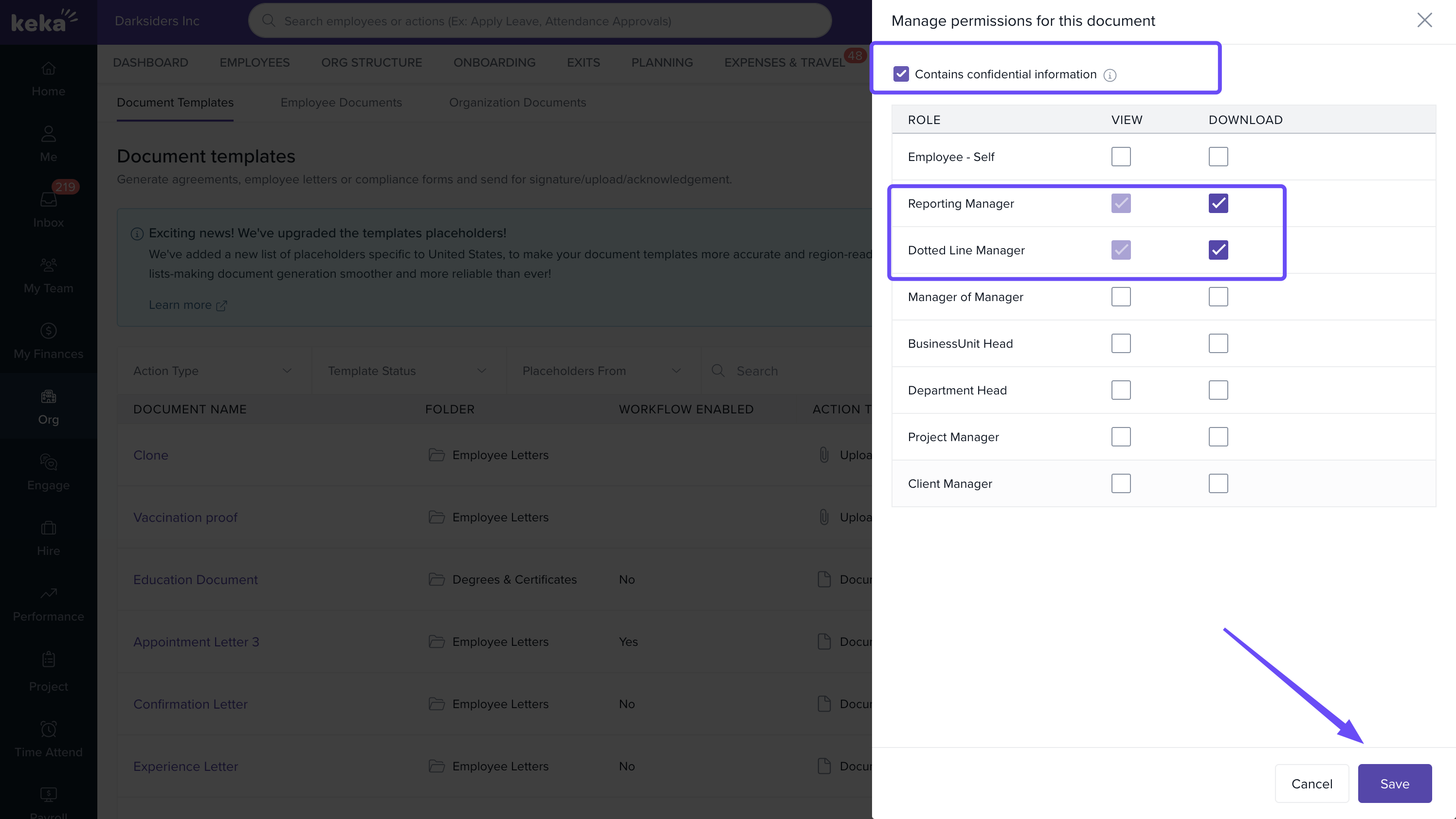 In Keka, you can limit access to sensitive employee documents and letter templates by marking them as confidential. This ensures that only authorized users can view or manage these items, keeping your HR data secure.