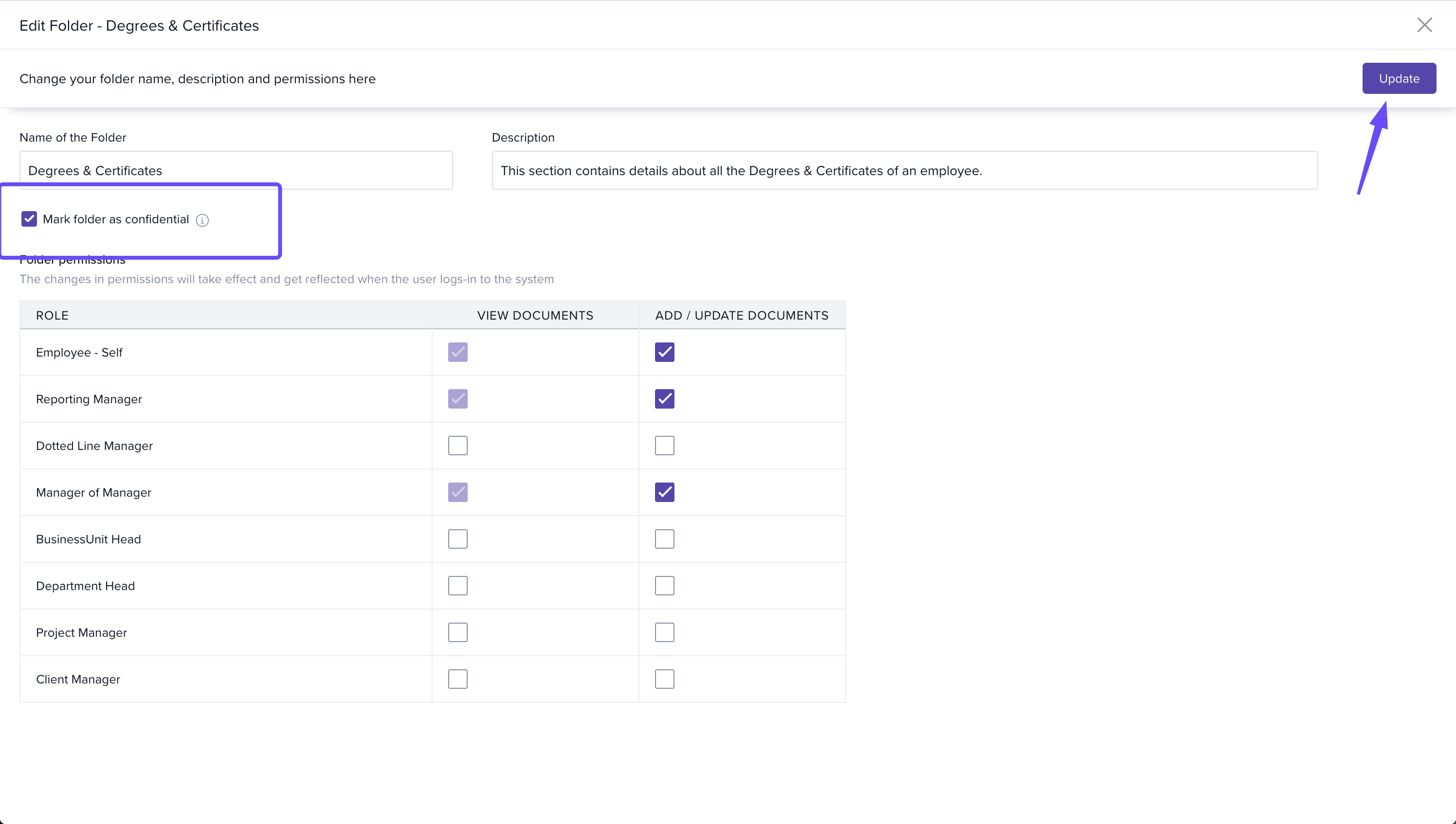 If granted folder-level permission, Reporting Managers can access their team’s confidential documents—even without the confidential access permission.