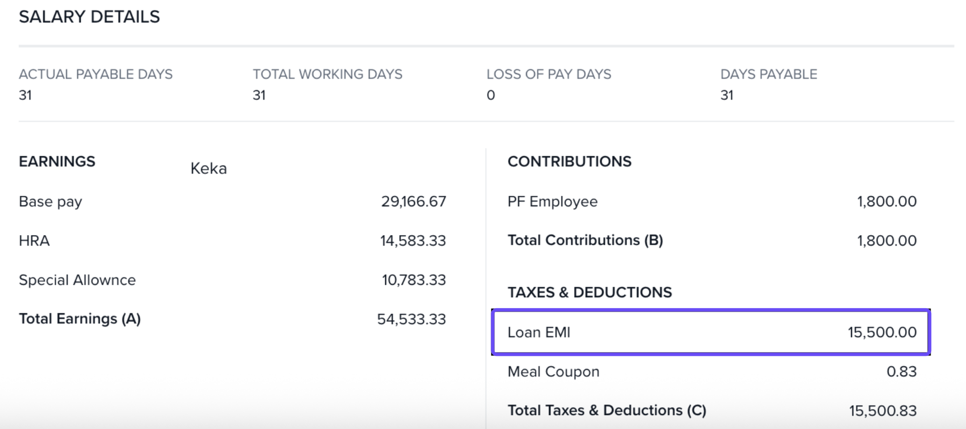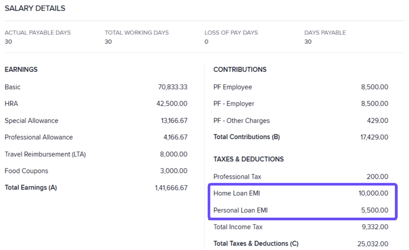 Payslip / Reports: Separate line items per category—e.g., Personal loan EMI, Medical loan EMI, Housing loan EMI, Education loan EMI.