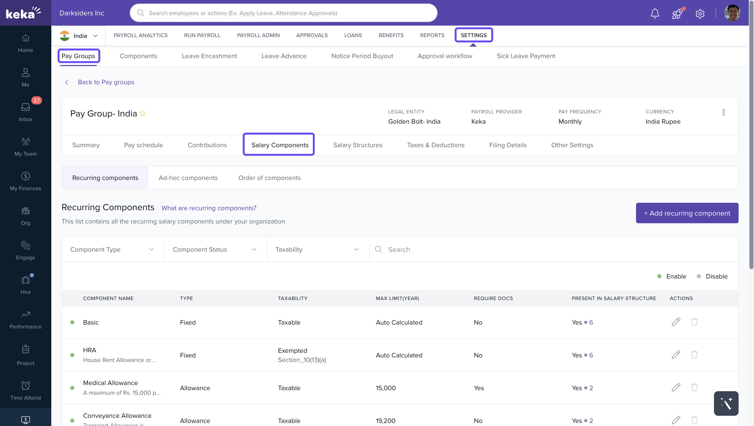 - Path: Settings → Pay Group → Salary Components