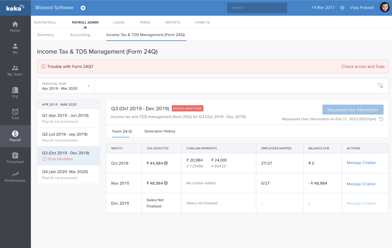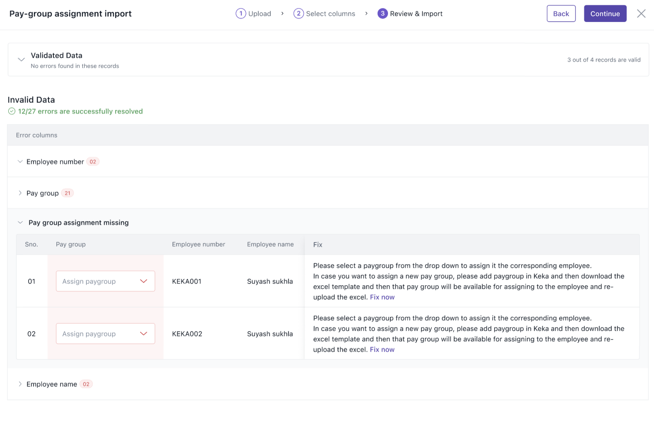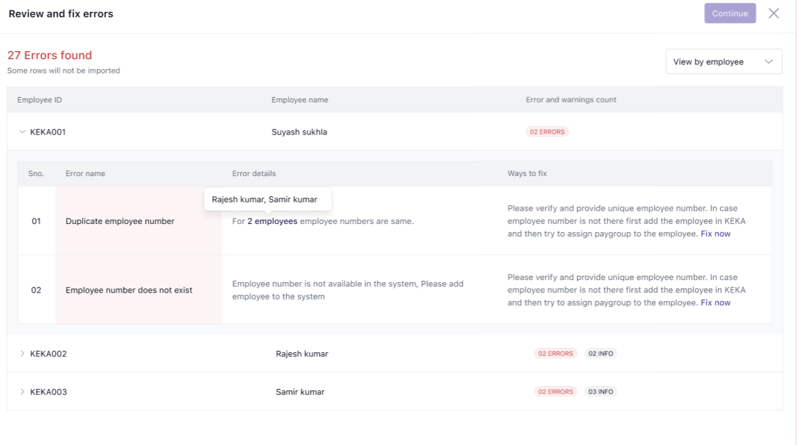 With the Errors and Guided Fixes feature, Keka clearly shows users what went wrong, why it occurred, and how to resolve it. Instead of generic error messages, you now see structured details and recommended fixes at the exact step where the error is encountered.
