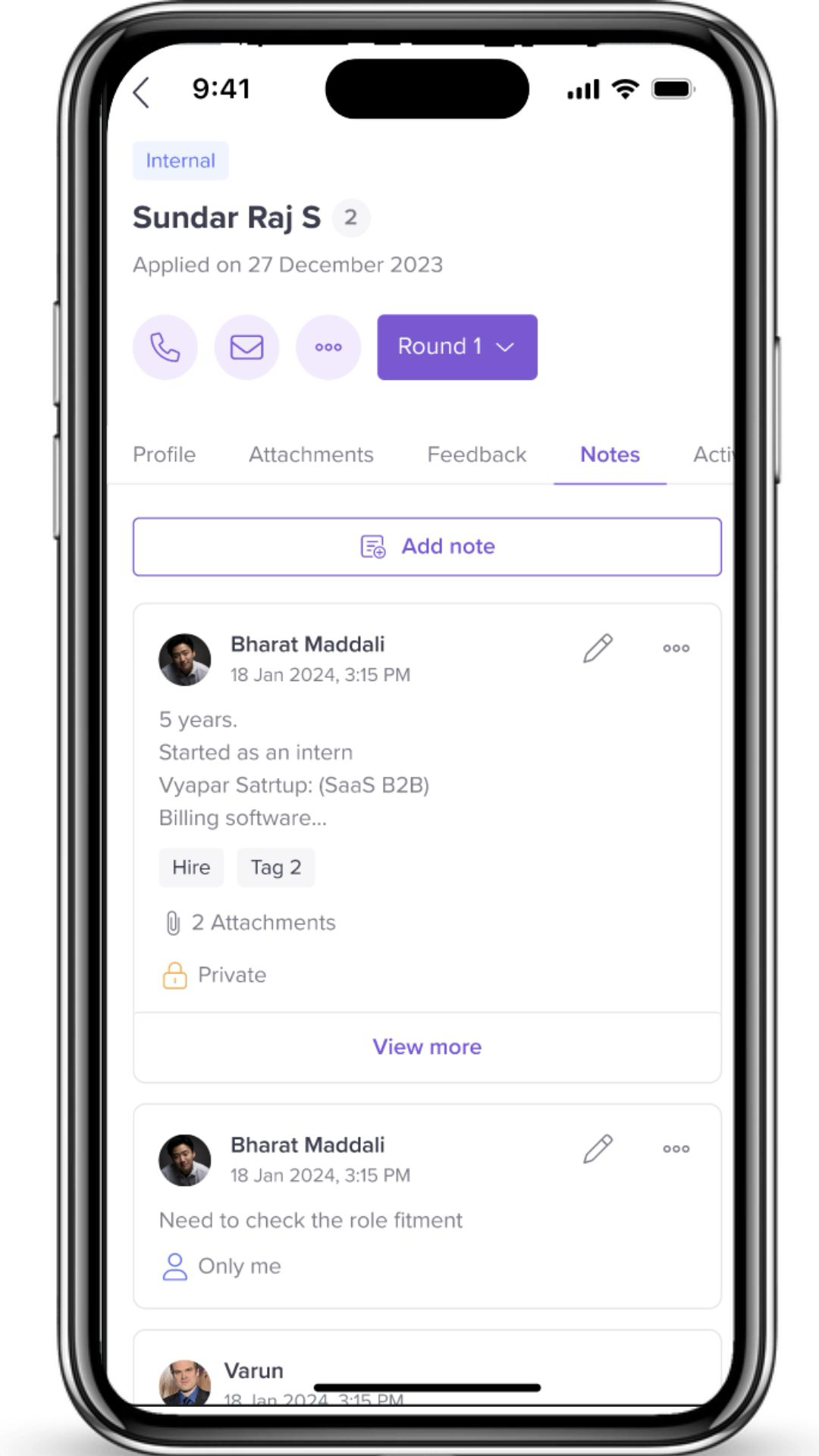 Now, let's examine the notes section of the candidate's profile, where you can find any notes added by interviewers, hiring managers and other relevant stakeholders. You can add the note by clicking add note button.