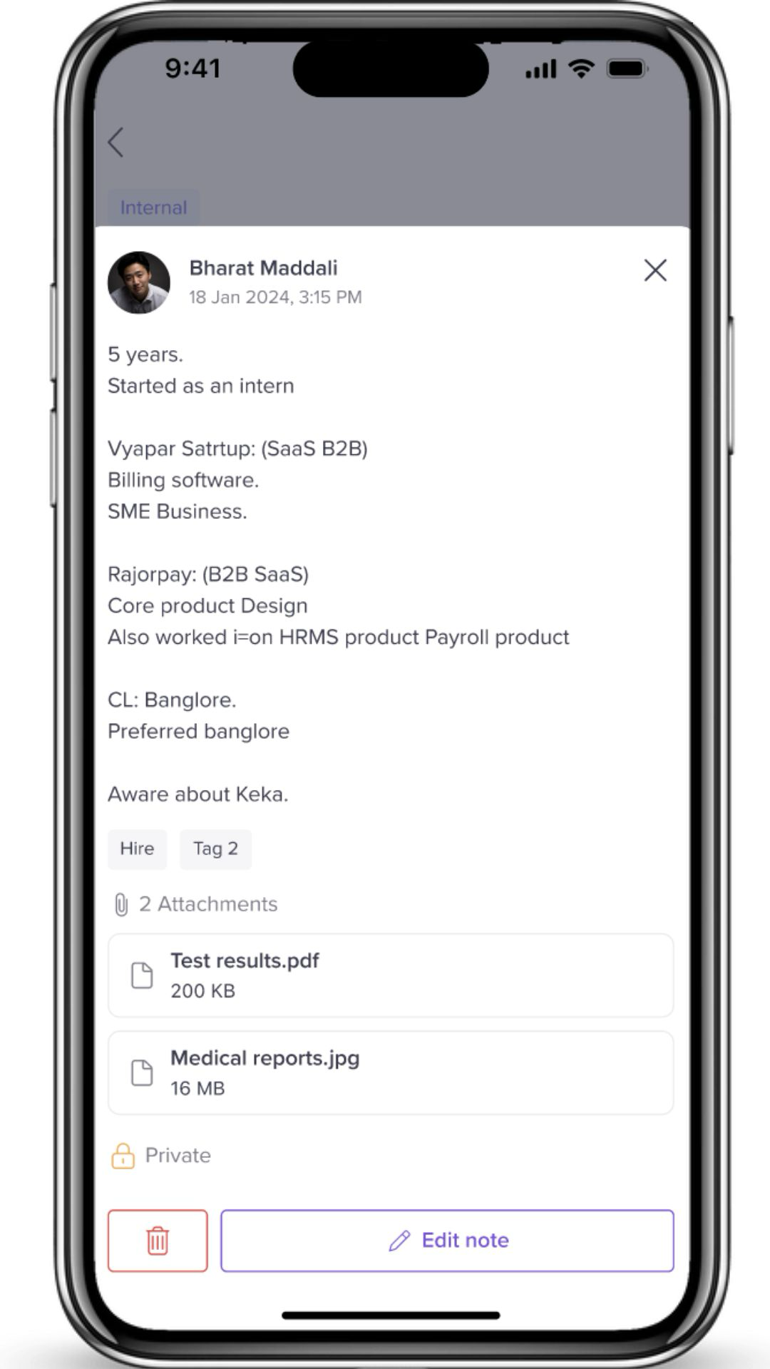 In the add note screen, you will first need to enter your note and then assign it an appropriate tag as required. Additionally, you have the option to attach a file to the note, which could include documents such as the candidate's certificate, assessment results, or any other relevant materials. You can also specify who can view these notes; for instance, you can choose to keep them private or make them visible to everyone. This feature serves as a convenient way for you to jot down quick notes about the candidate, which can later be expanded into more detailed feedback. Options for visibility include confidential notes or those accessible to all stakeholders.