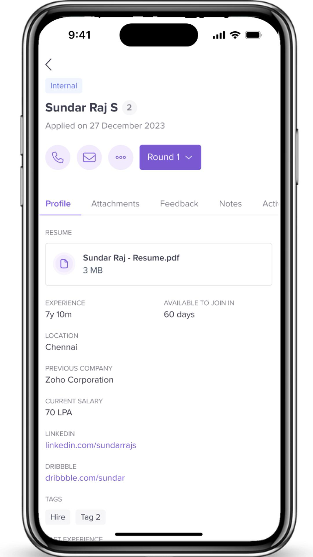 When you select a candidate, you will see their profile page which includes their resume, total experience, location, previous employment, and links to their LinkedIn and Dribble profiles if available. You can also view their salary expectations and availability to join the organization.
