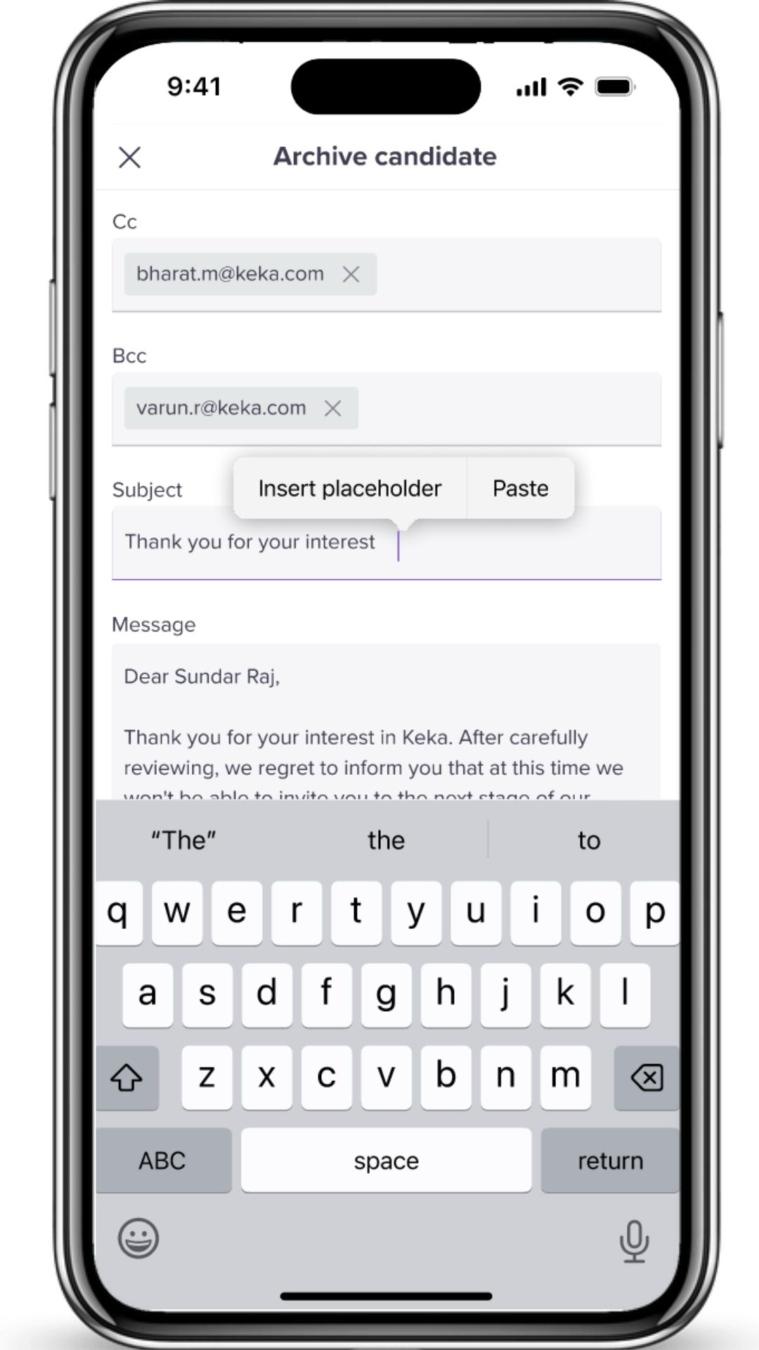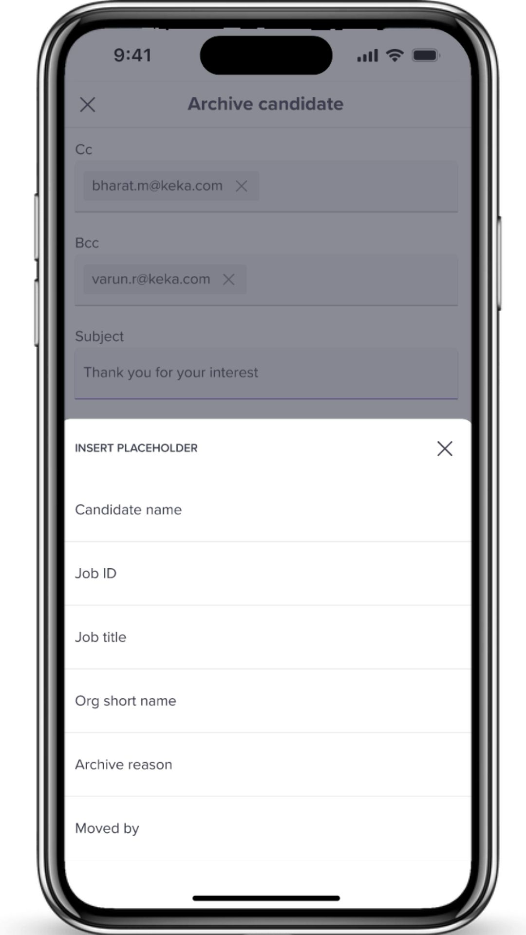 Managing candidate profiles on the Keka Mobile App streamlines the recruitment process, enabling you to access critical candidate information and perform key actions anytime, anywhere. Whether you're transitioning candidates through various stages, providing feedback, or archiving profiles, the app provides a user-friendly interface designed to enhance efficiency for hiring managers and recruiters. By leveraging features like placeholders, templates, and detailed activity tracking, you can ensure that all recruitment actions are consistent, transparent, and well-documented.