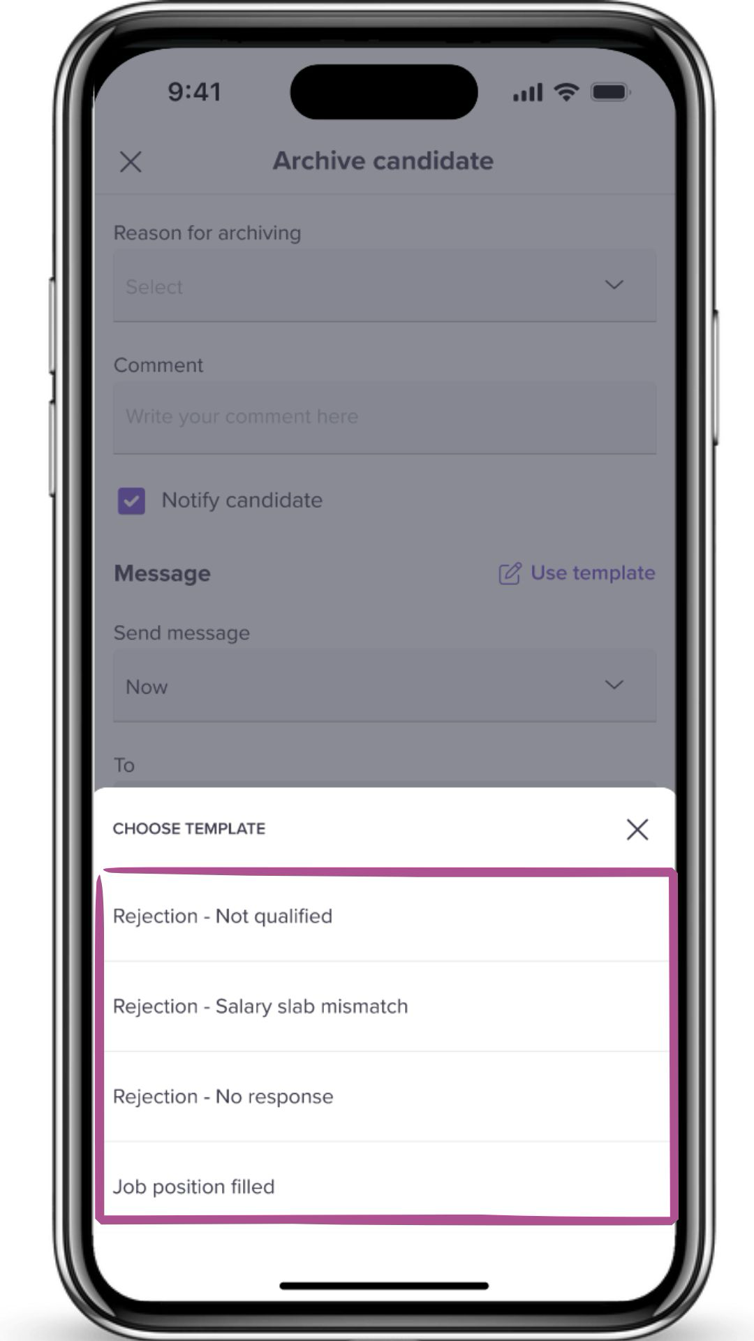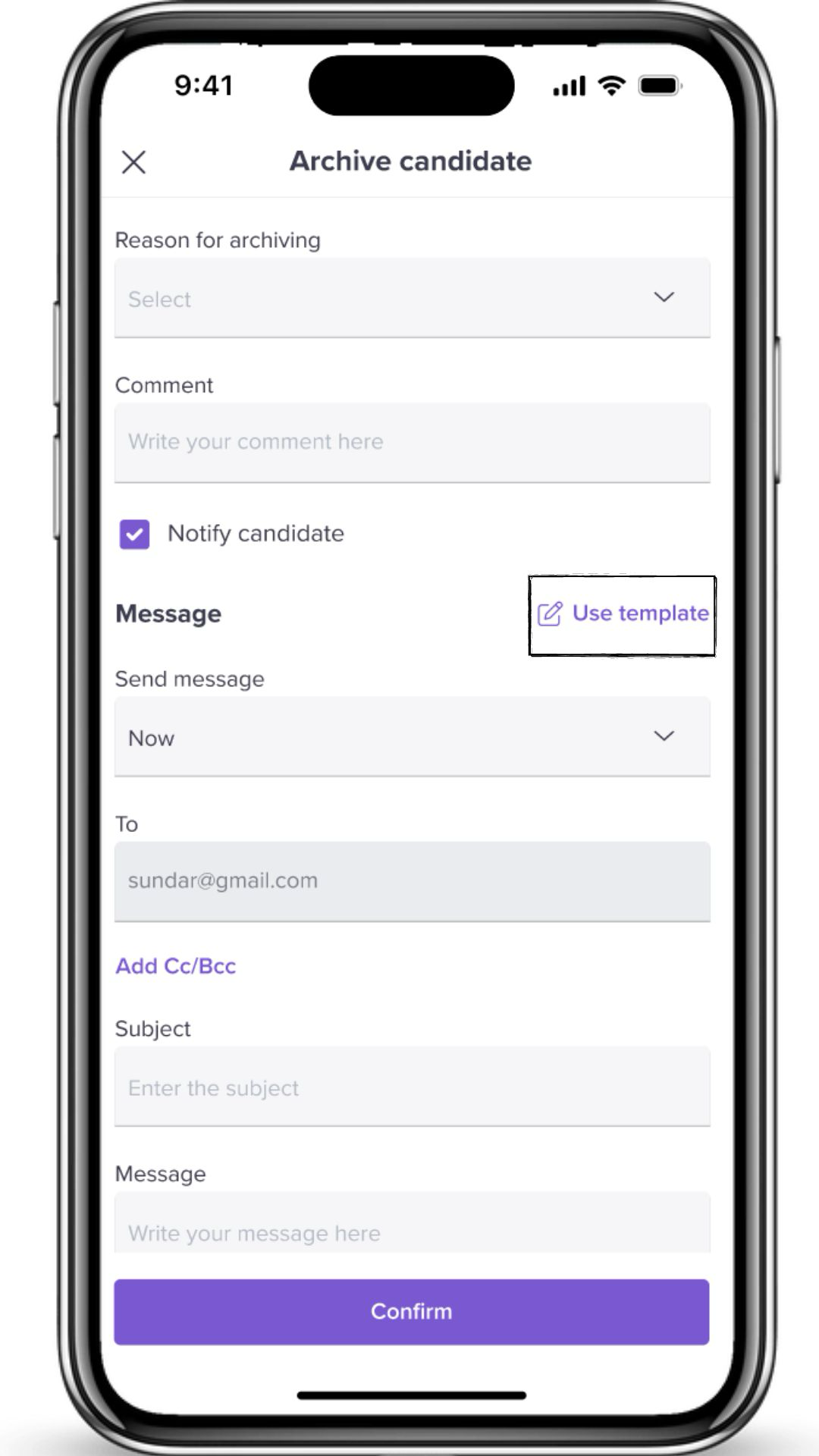 Another useful feature is the ability to use templates when archiving candidates. Instead of composing a new message every time, you can easily select from the templates you have created previously by clicking on the Use Template button located next to the message field.