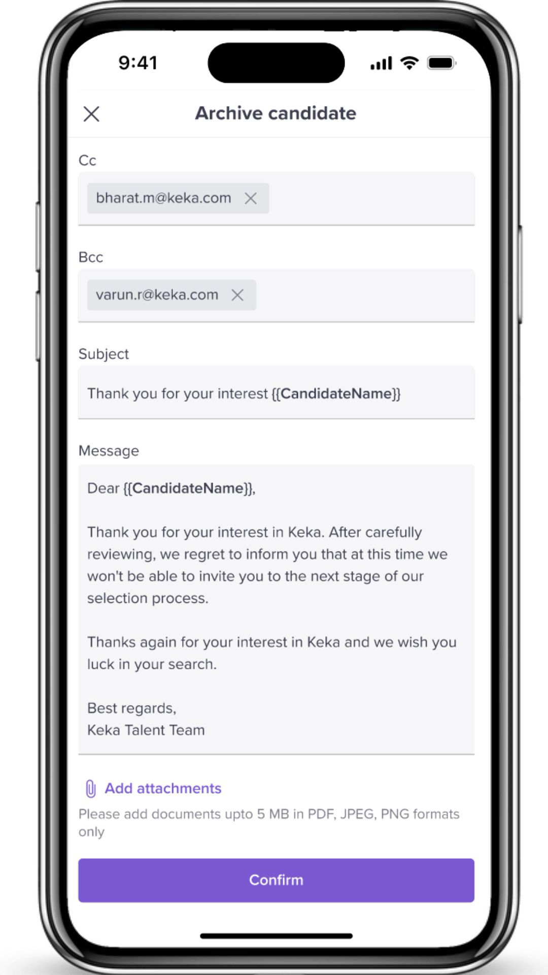 You also have the option to archive a candidate. To do this, tap on the three dots and select Archive Candidate. You will then be prompted to enter a reason for archiving and provide a comment. Additionally, you can choose to notify the candidate by selecting the checkbox. If you opt to notify them, you can customize the message that will be sent, as well as specify when it should be delivered. You can also include any relevant users in the CC and BCC fields. Once you have composed your message, click Confirm to successfully archive the candidate.