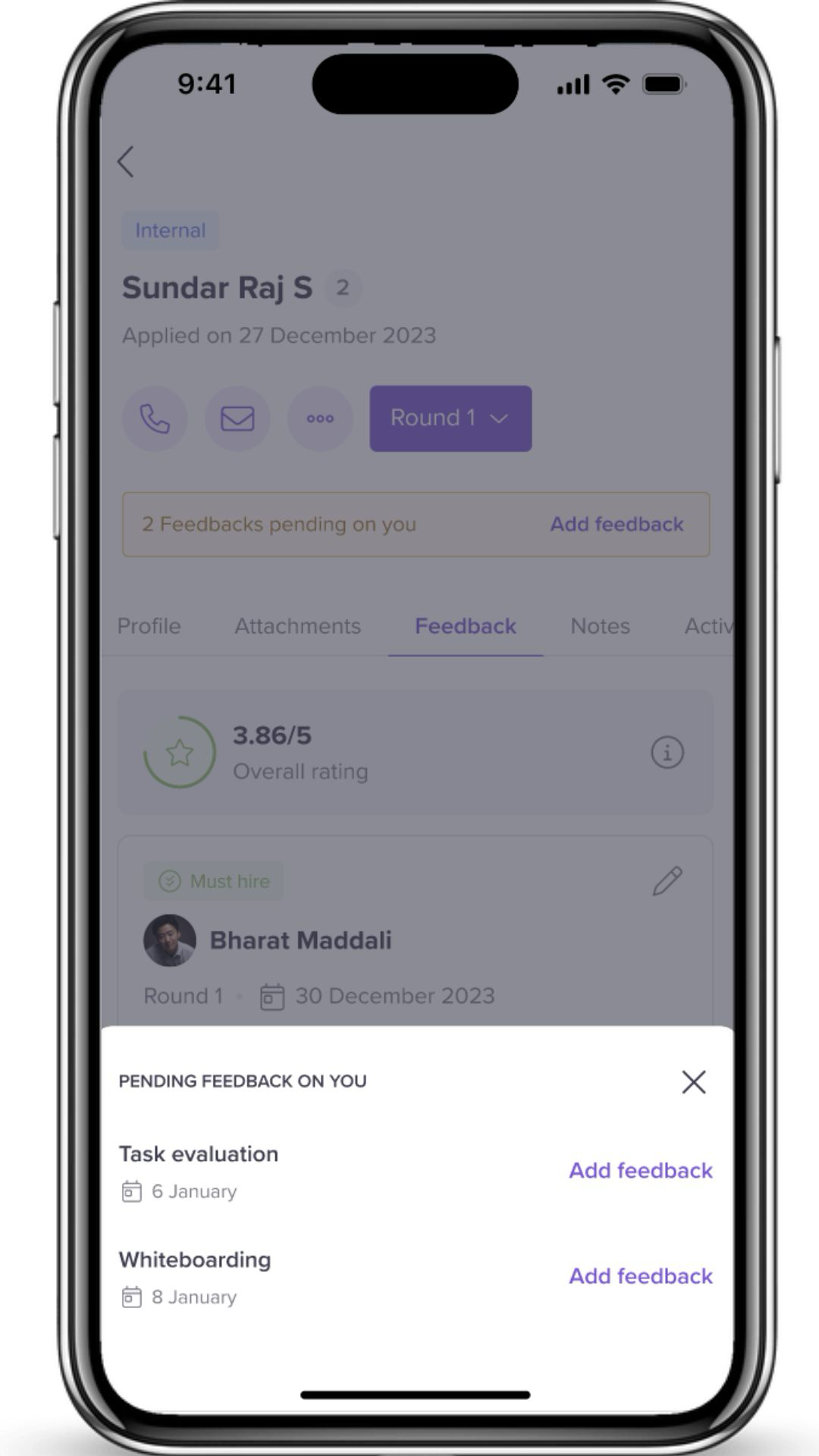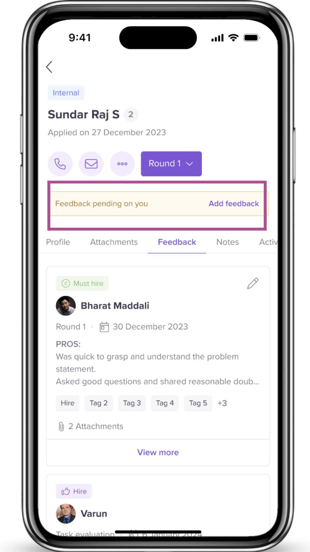 In the candidate profile you will also see a message if feedback for the candidate is pending on you, you can go ahead and click on add feedback.