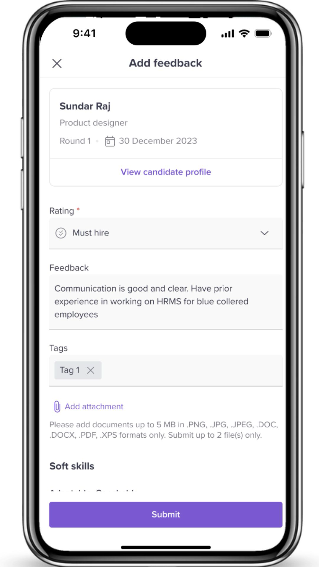 You can complete the feedback section by entering your comments and assigning ratings based on your assessment and click submit.