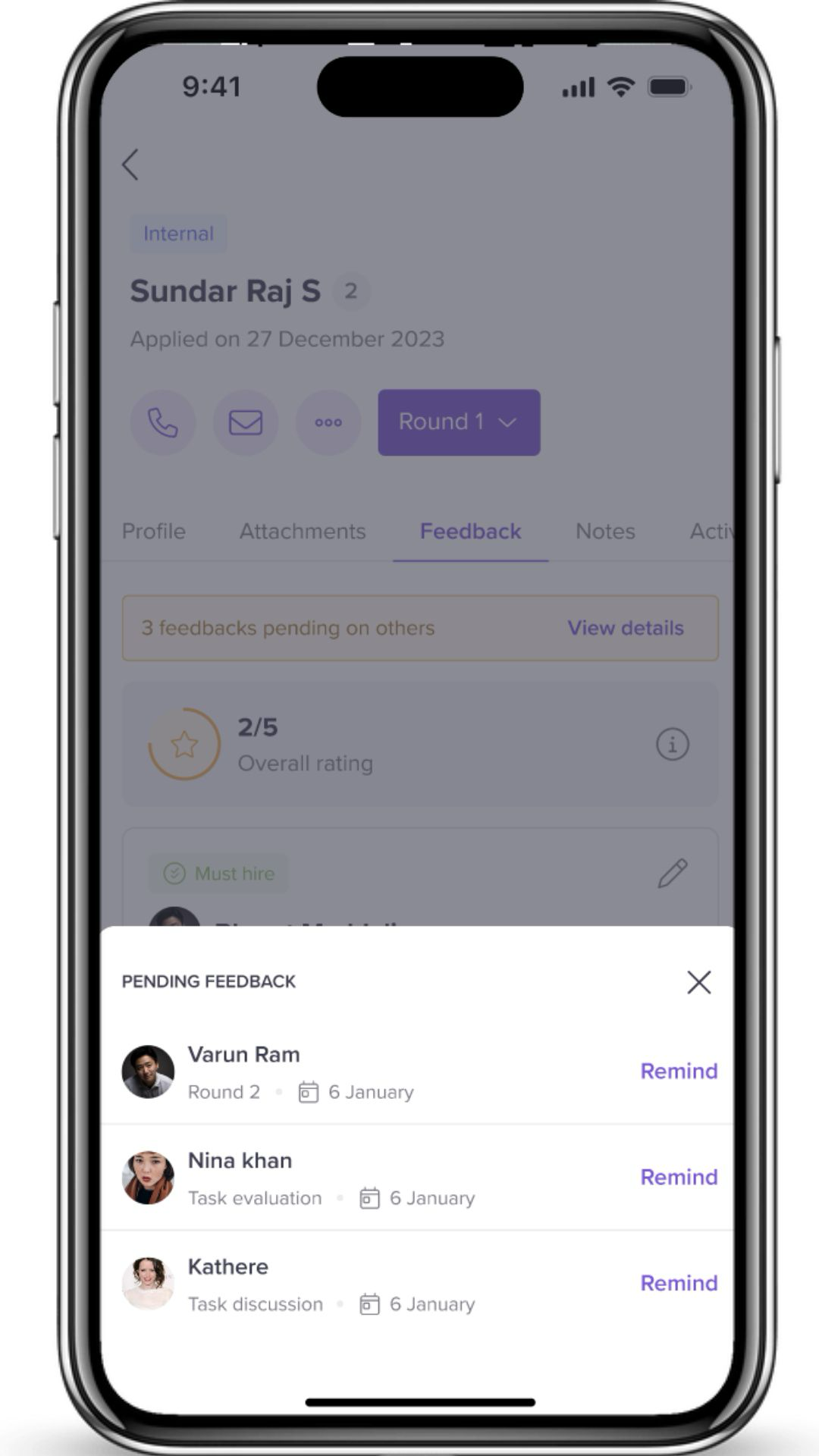 If there are pending feedback requests from other interviewers for the candidate, this will be indicated in their profile. You can click on View Details to see more information and send reminders to specific interviewers to prompt them for their feedback.
