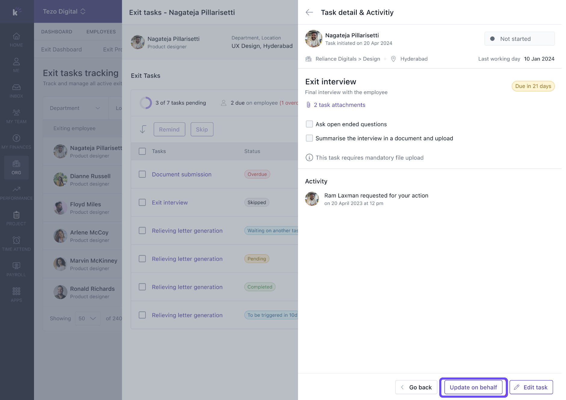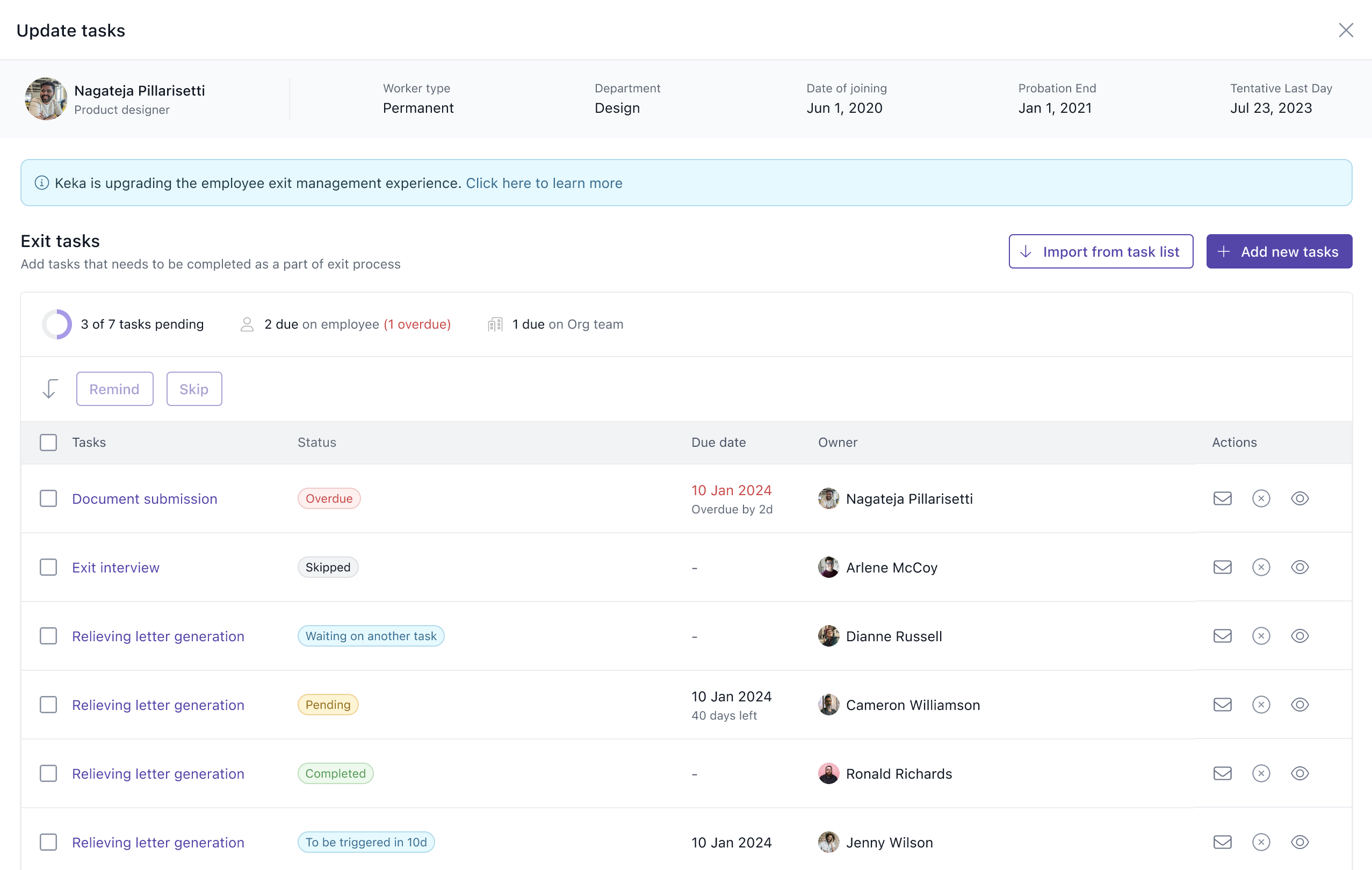 Keka now allows managers to update exit tasks on behalf of others if needed.