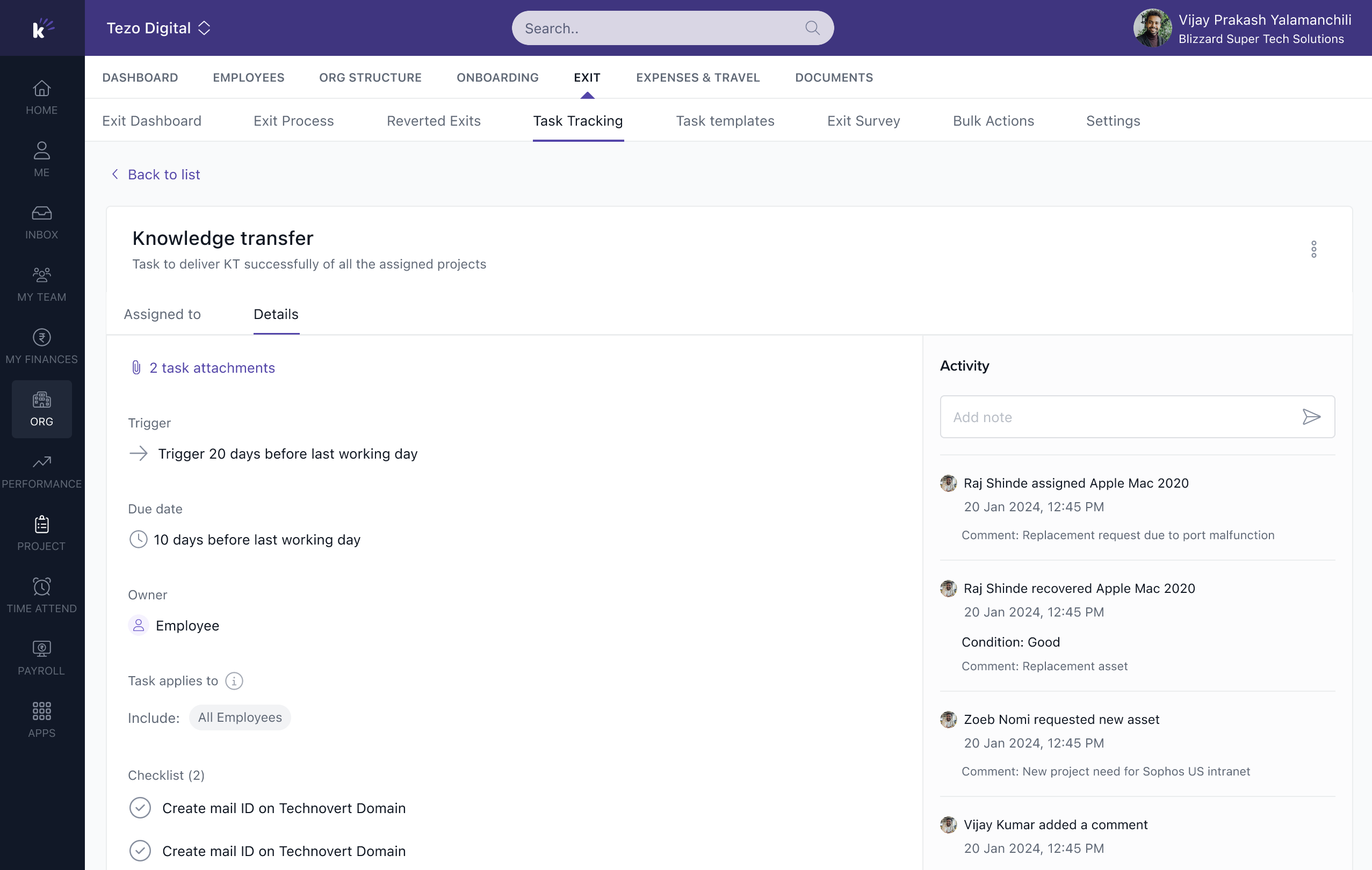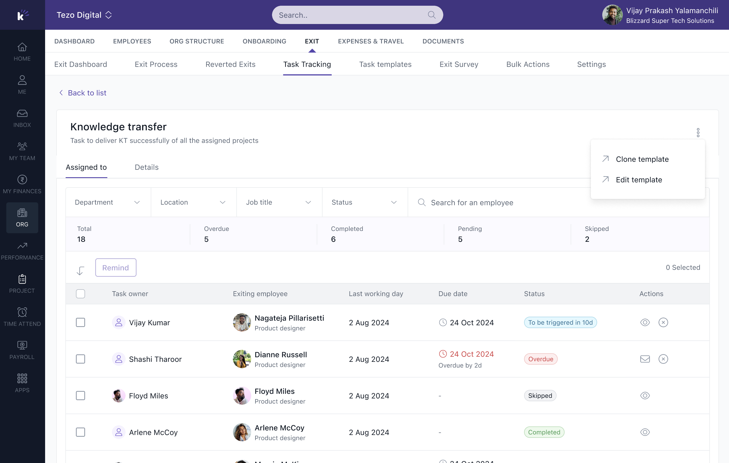 In the Assigned To section, you’ll find information such as the total number of tasks, overdue tasks, completed tasks, pending tasks, and skipped tasks. Additionally, you can view details like the task owner, exiting employee, last working day, due date, current status, and actions.