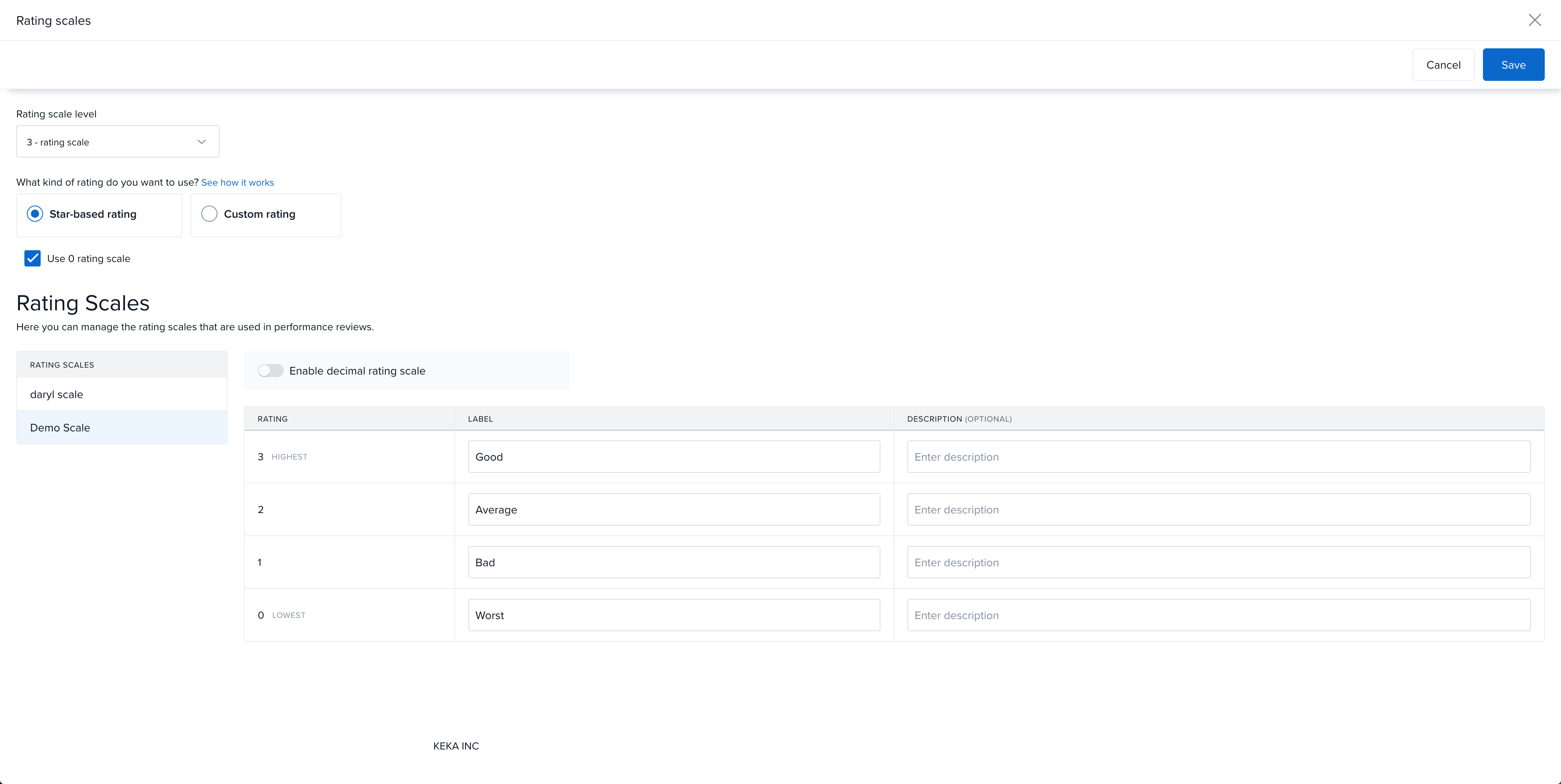 Go to Settings > Keka Support Operations > Performance > Update Rating Scale.