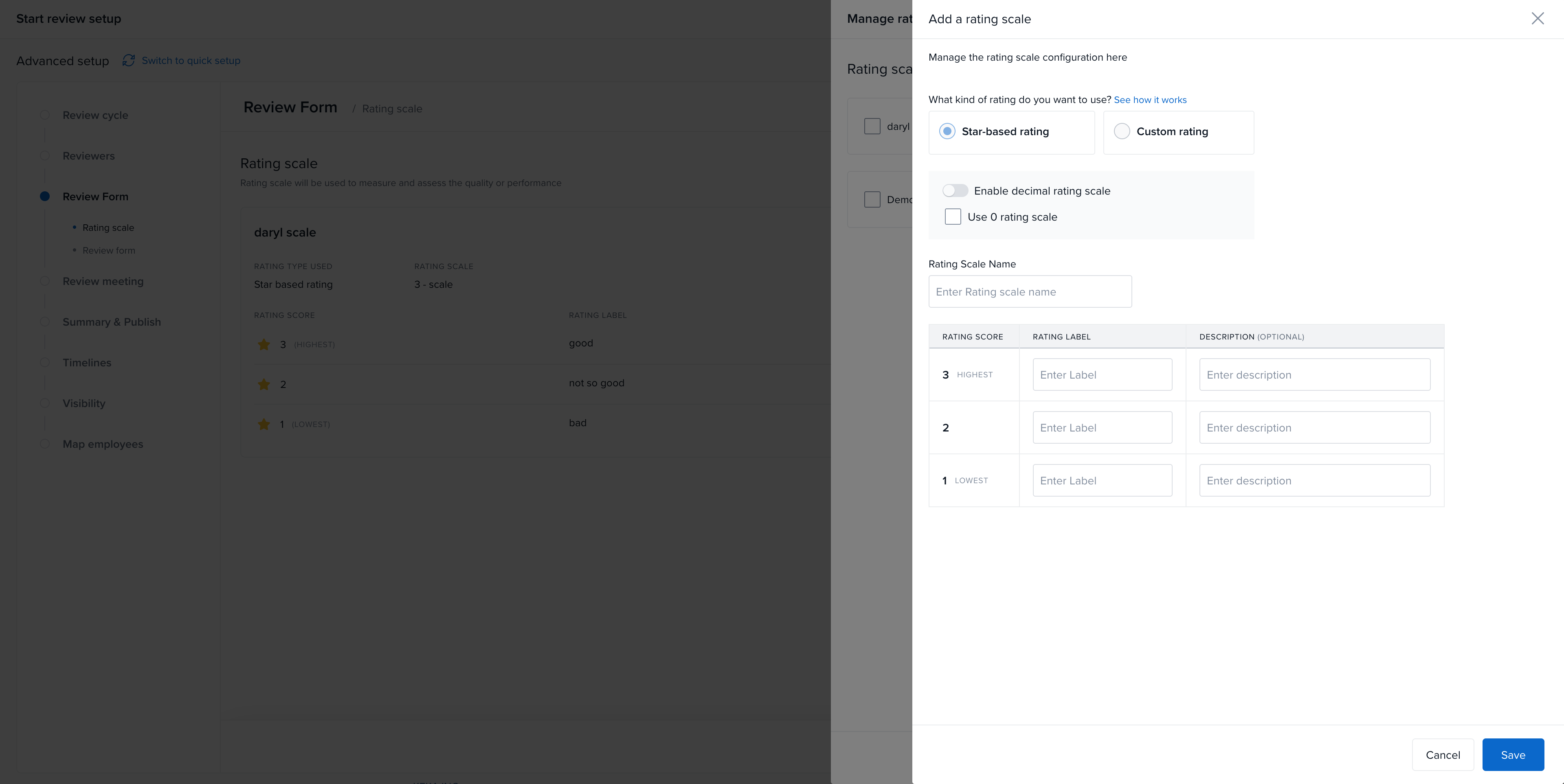 Once this is enabled, any new rating scale created under Performance>> Reviews can include ‘0’ in the scale.