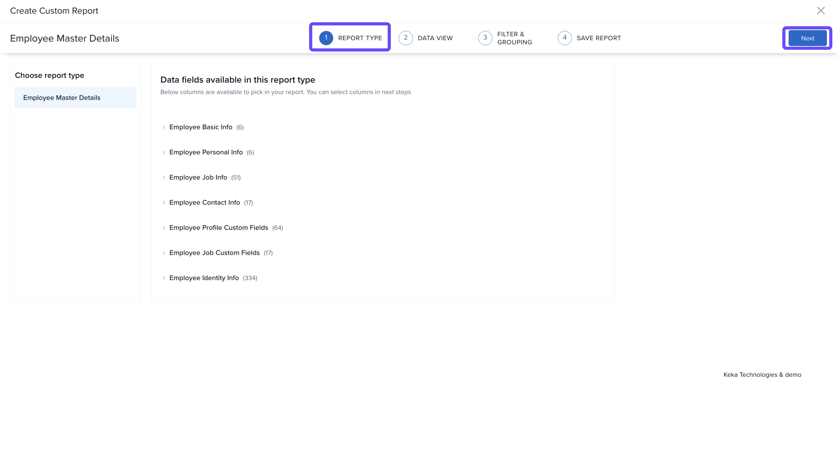 - In the Report Type step, select the report type you want to create (e.g., Employee Master Details) and click Next.