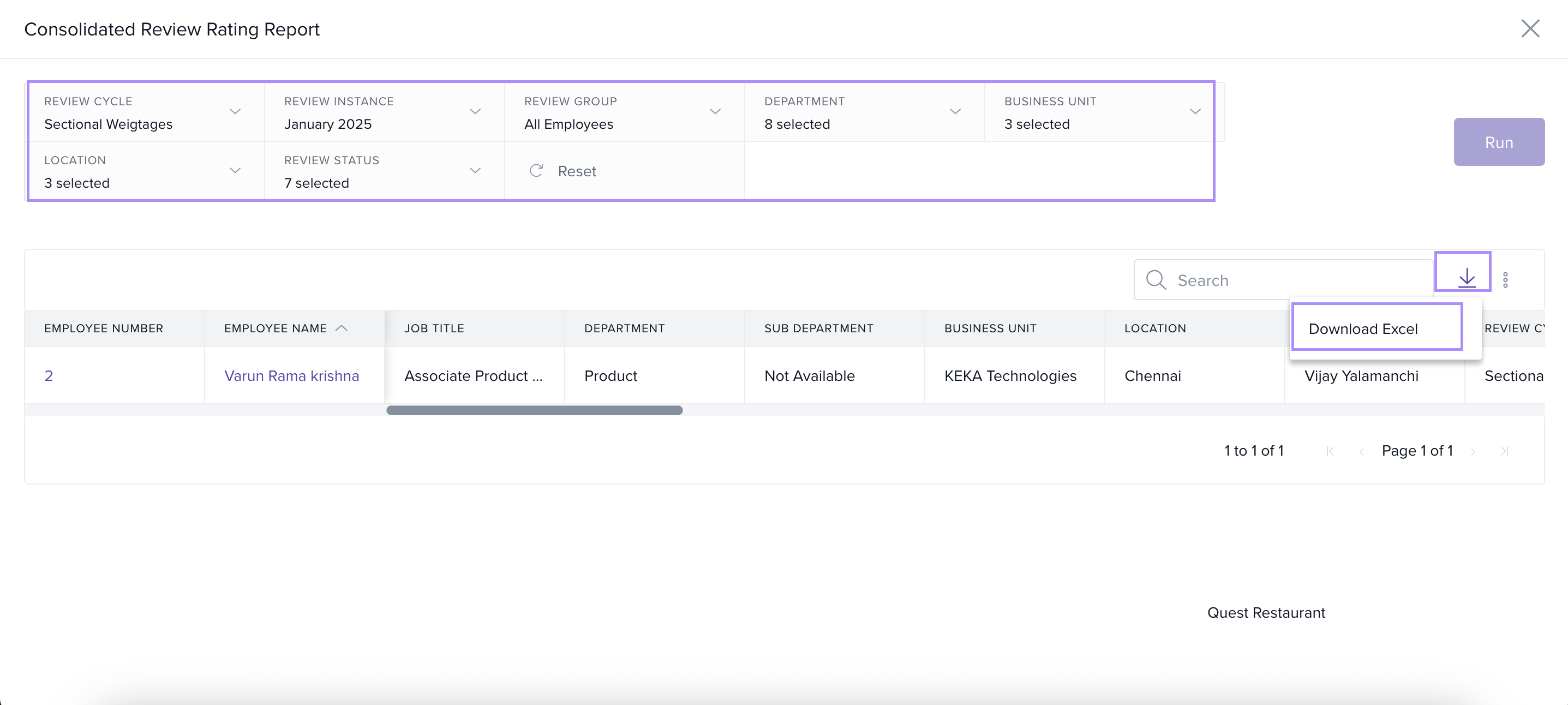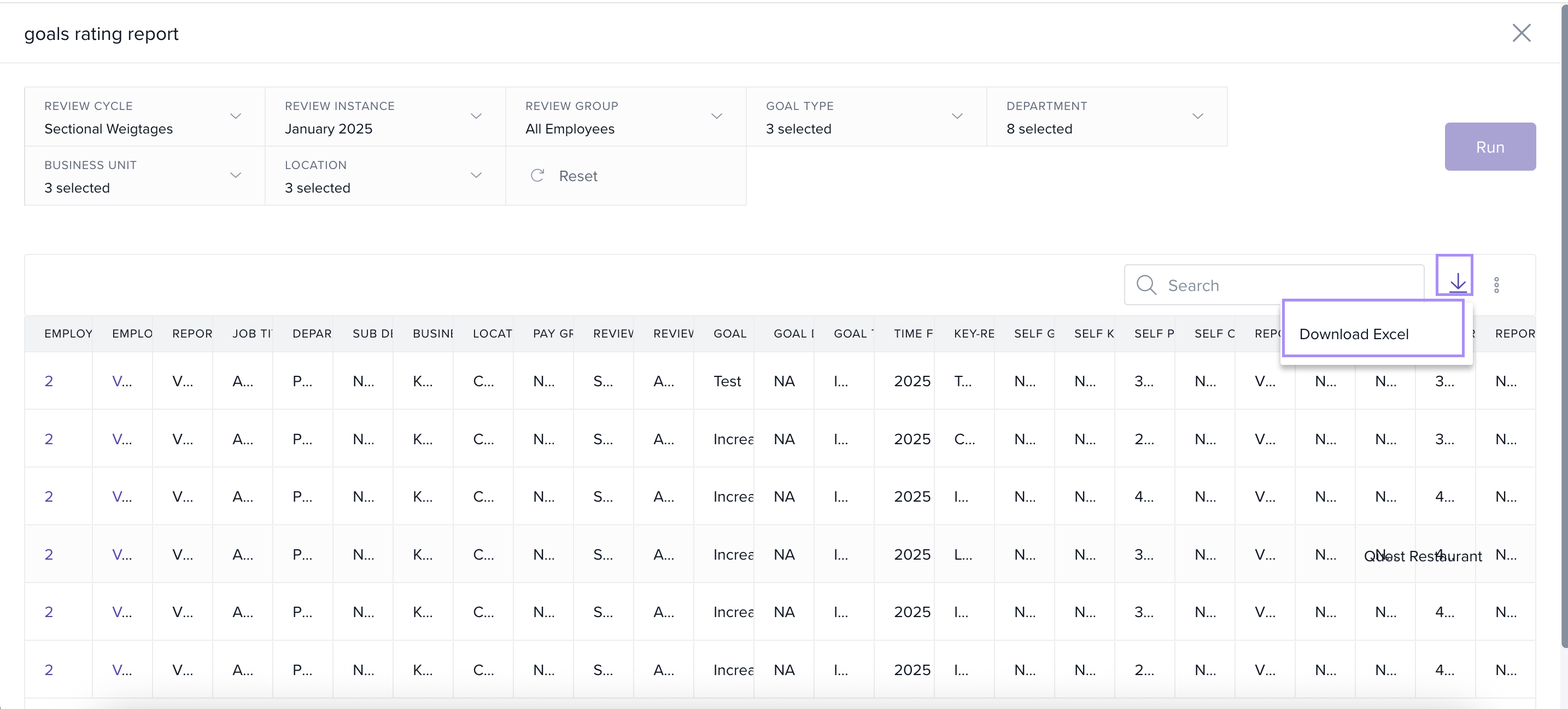 Once the report loads, it will display employee details, job titles, review cycles, and their respective ratings.