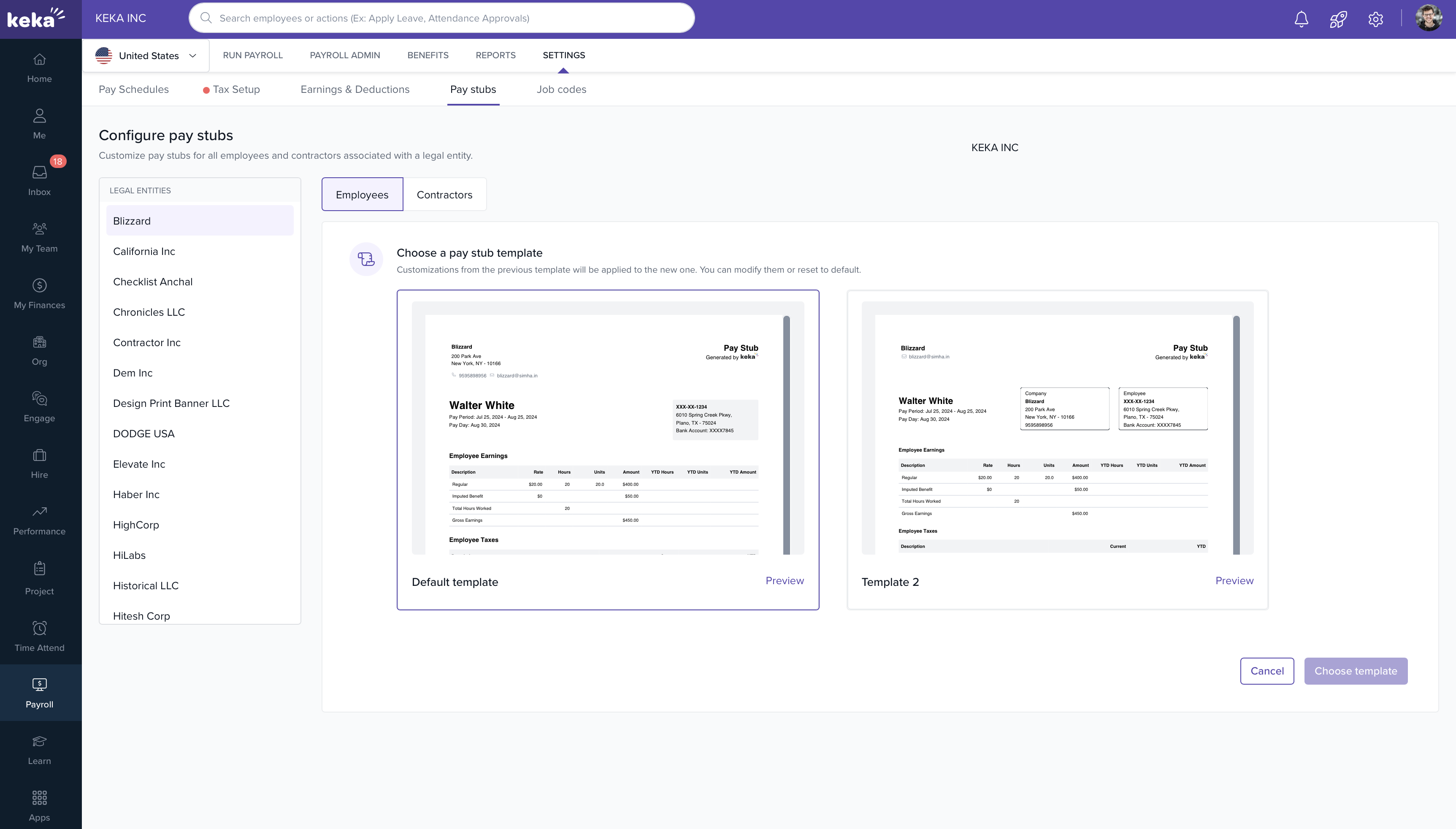 Separate templates for Employees (Pay Stubs) and Contractors (Earning Statements).