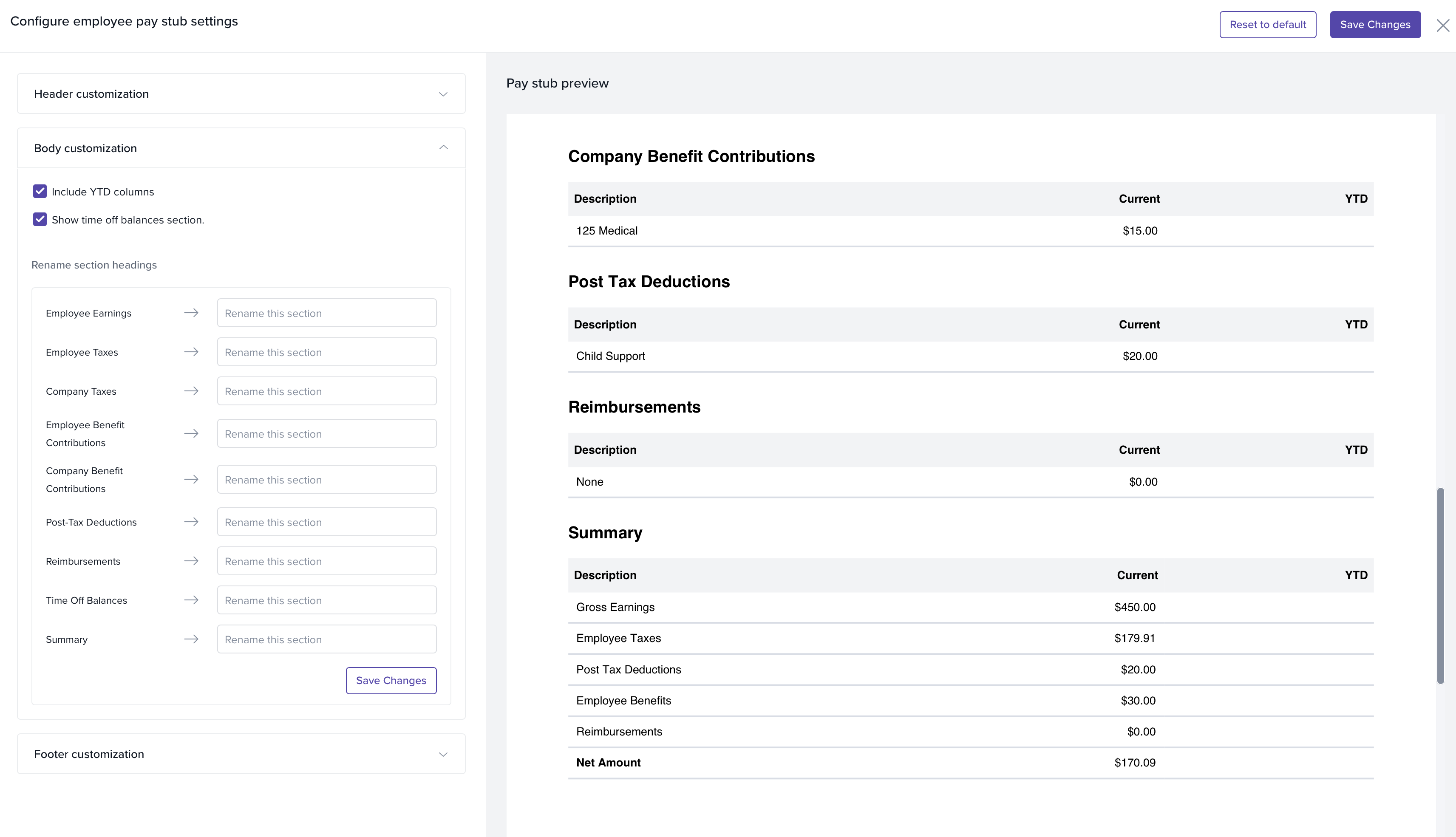 Flexible section control: include/exclude or rename earnings, taxes, deductions, benefits, reimbursements, time-off, and summaries.