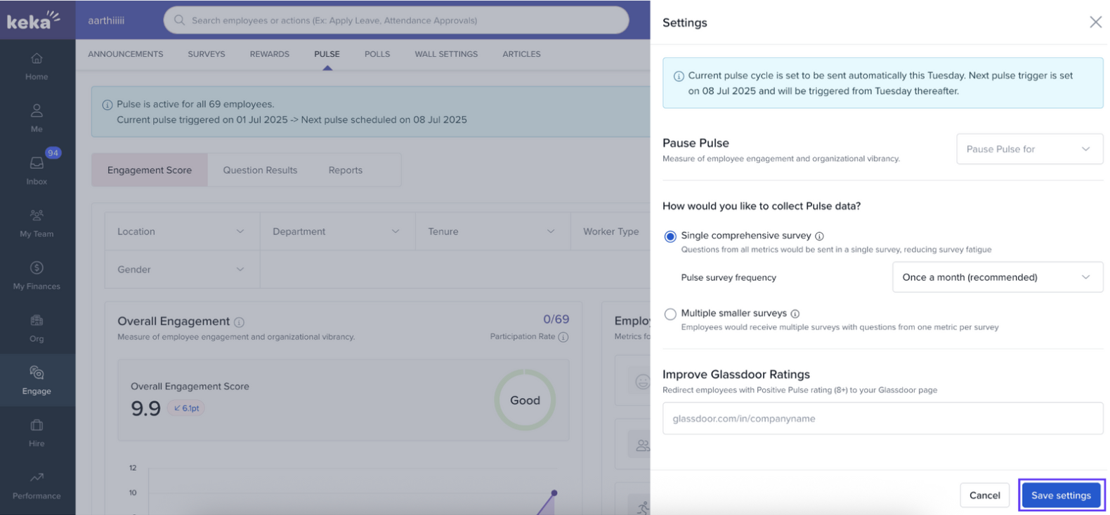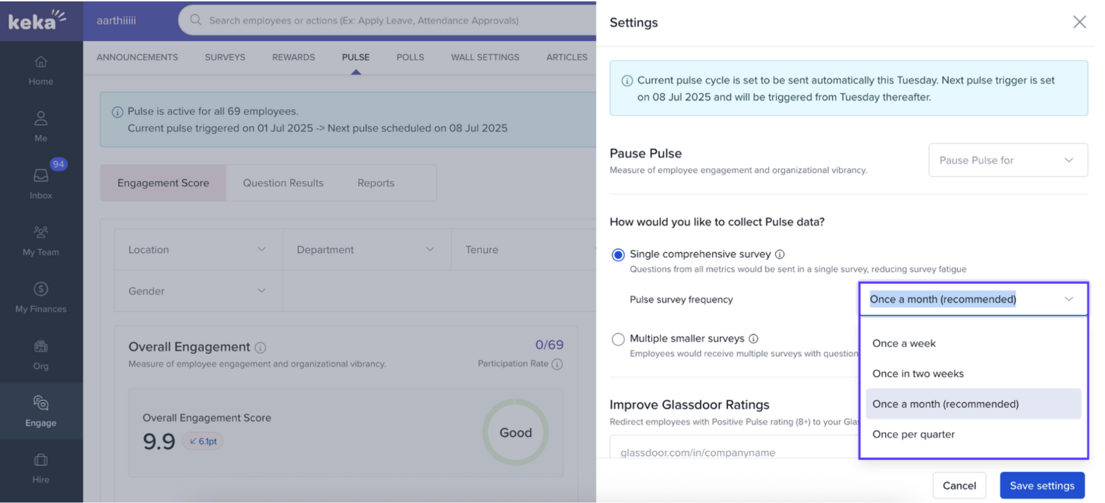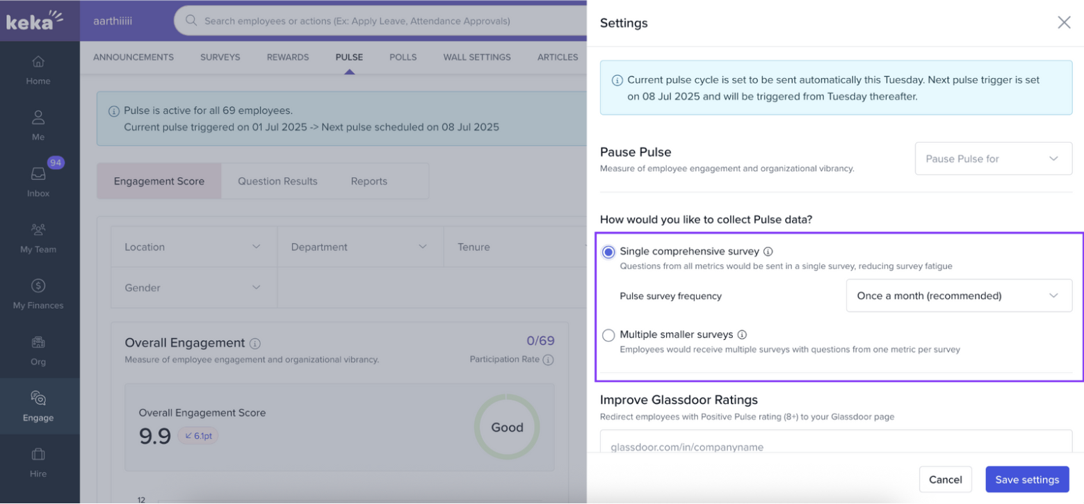Keka’s Single Comprehensive Survey Mode streamlines feedback collection by sending all engagement metric questions in one survey. This reduces survey fatigue and helps improve response rates—especially useful for smaller teams or organisations seeking deeper insights with fewer touch-points.