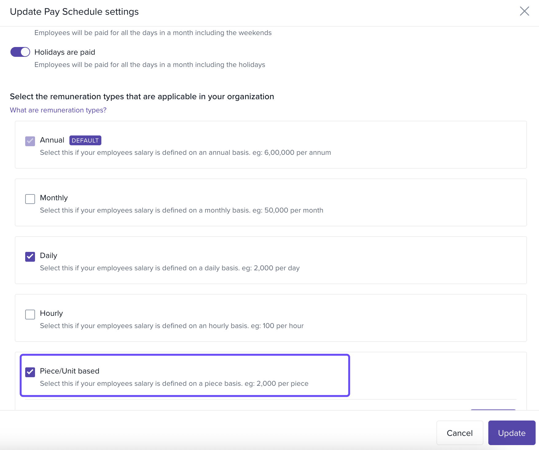 4. Enable Piece‑Based Remuneration under the Update Pay Schedule Settings section.