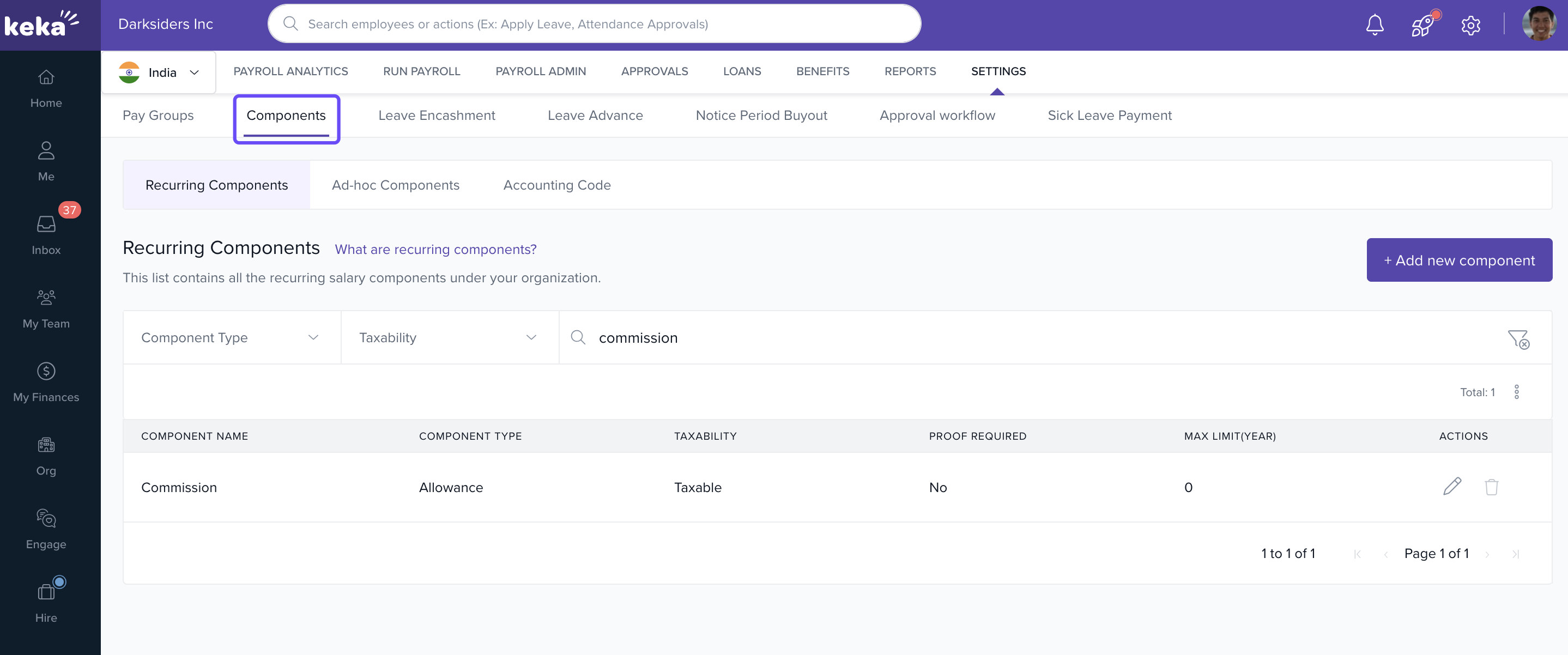 Keka automatically adds a default component named Commission for use in Piece-Based Remuneration.