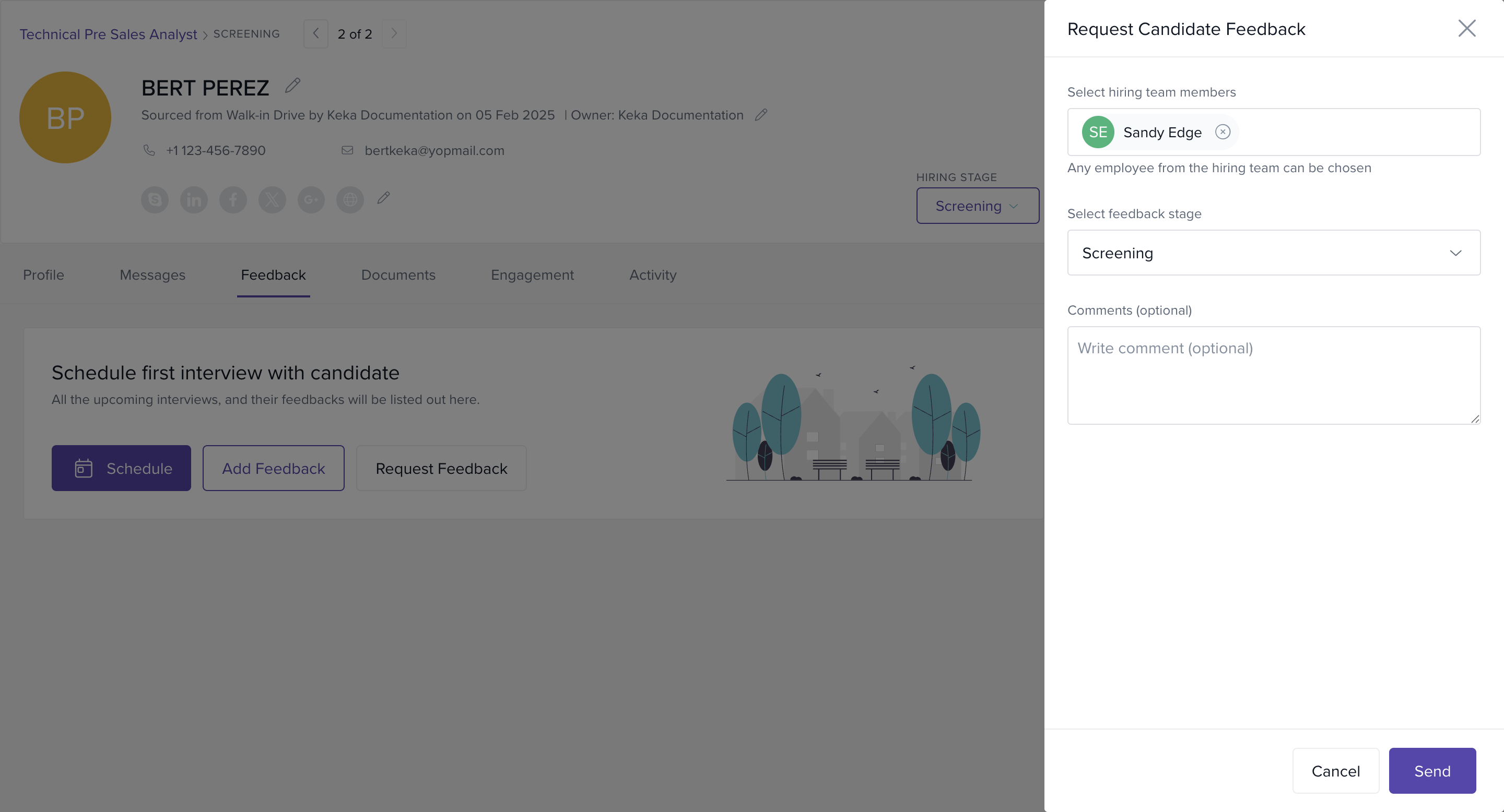 Recruiters can now request adhoc feedback from members of the hiring team at any time—not just after interviews. This feature helps collect a clear Go/No-Go decision directly in the system, replacing scattered feedback shared via notes or email.