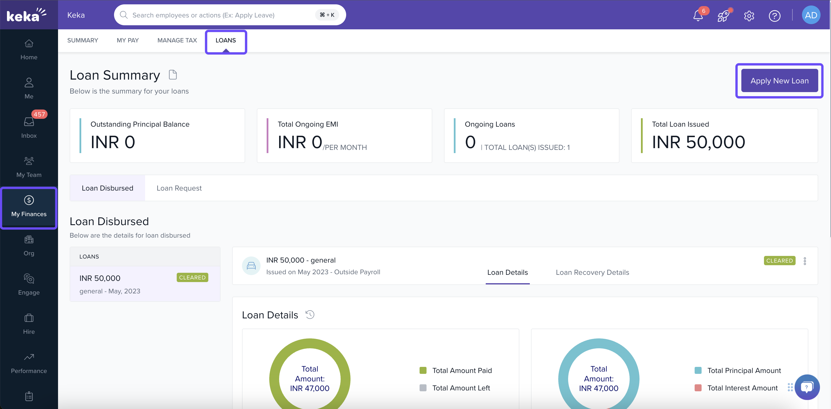 Log in to Keka → click My Finances in the sidebar. -