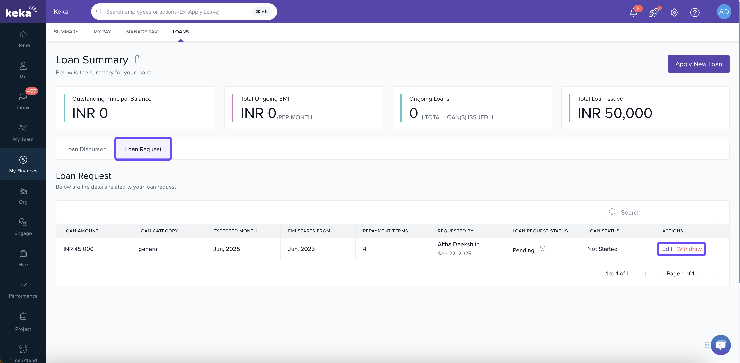 To view your loan request progress, navigate to Loan Request in the Loans section. Here, you can see if your application is marked as Pending, Approved, or Declined. You can also edit or withdraw your request before any action is taken.