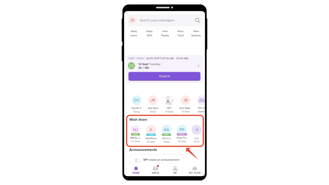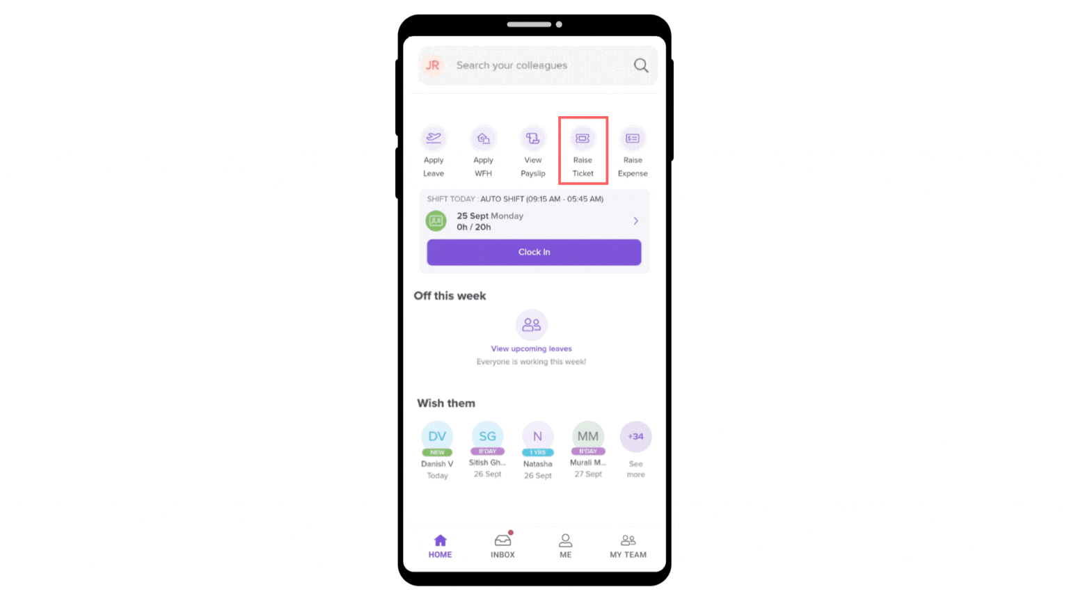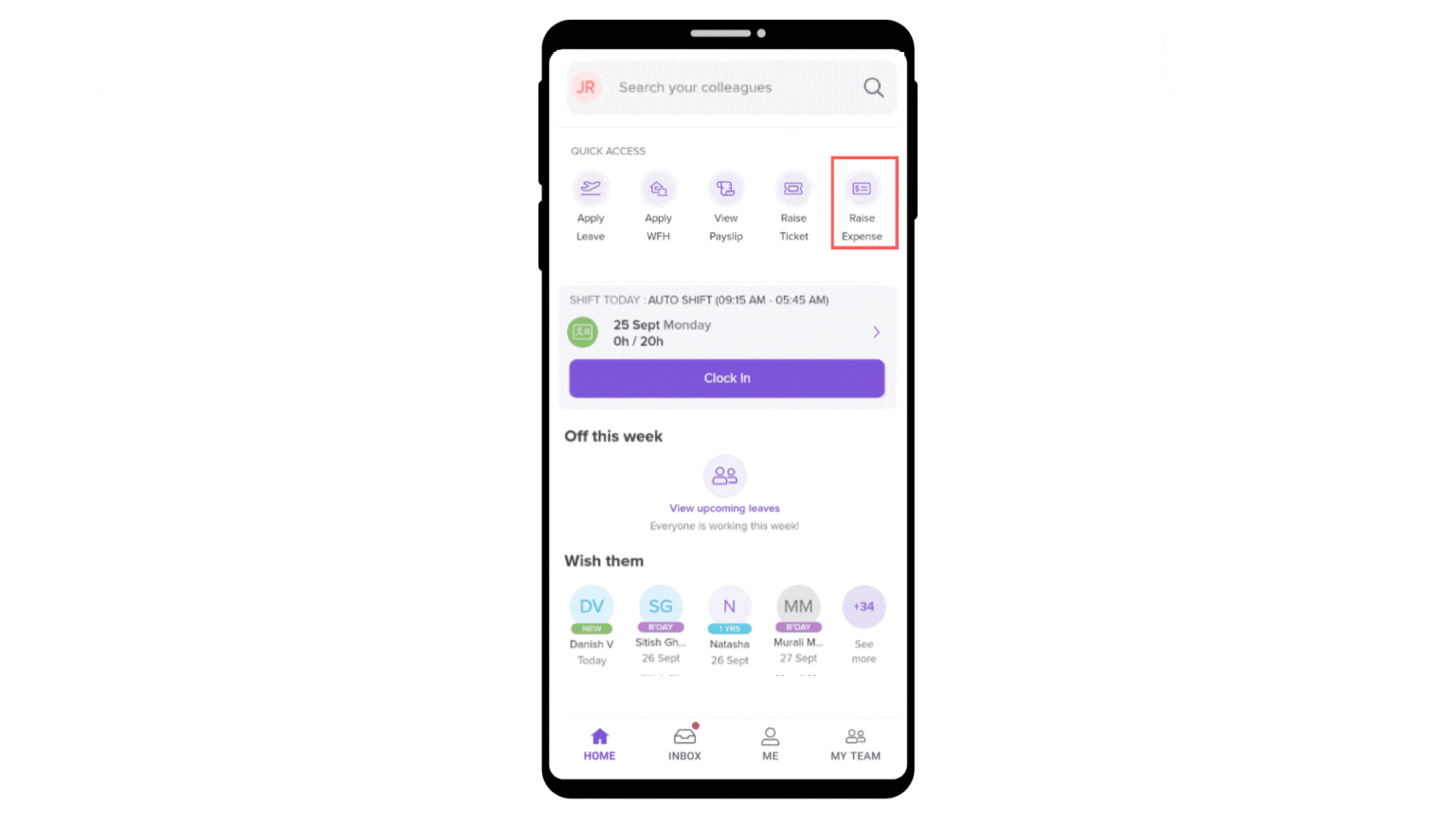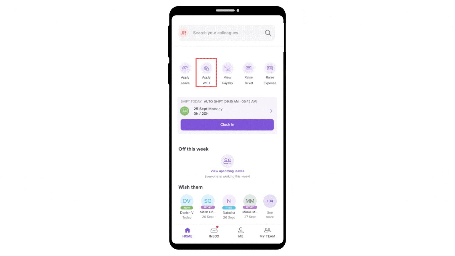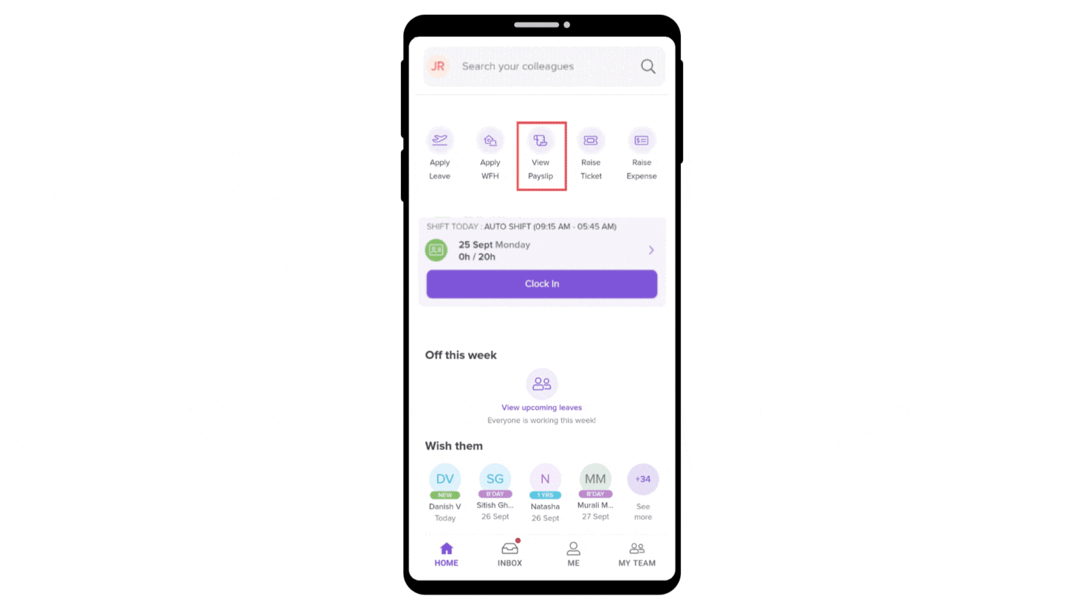The Home section in the Keka mobile app keeps you up-to-date with your work schedule and attendance. The Shift widget allows you to clock in quickly and even check your attendance history for the past days.