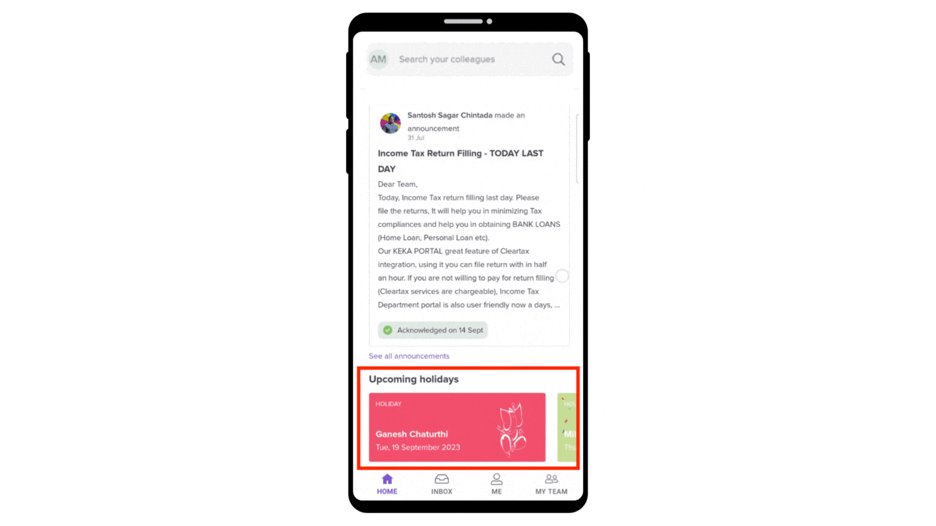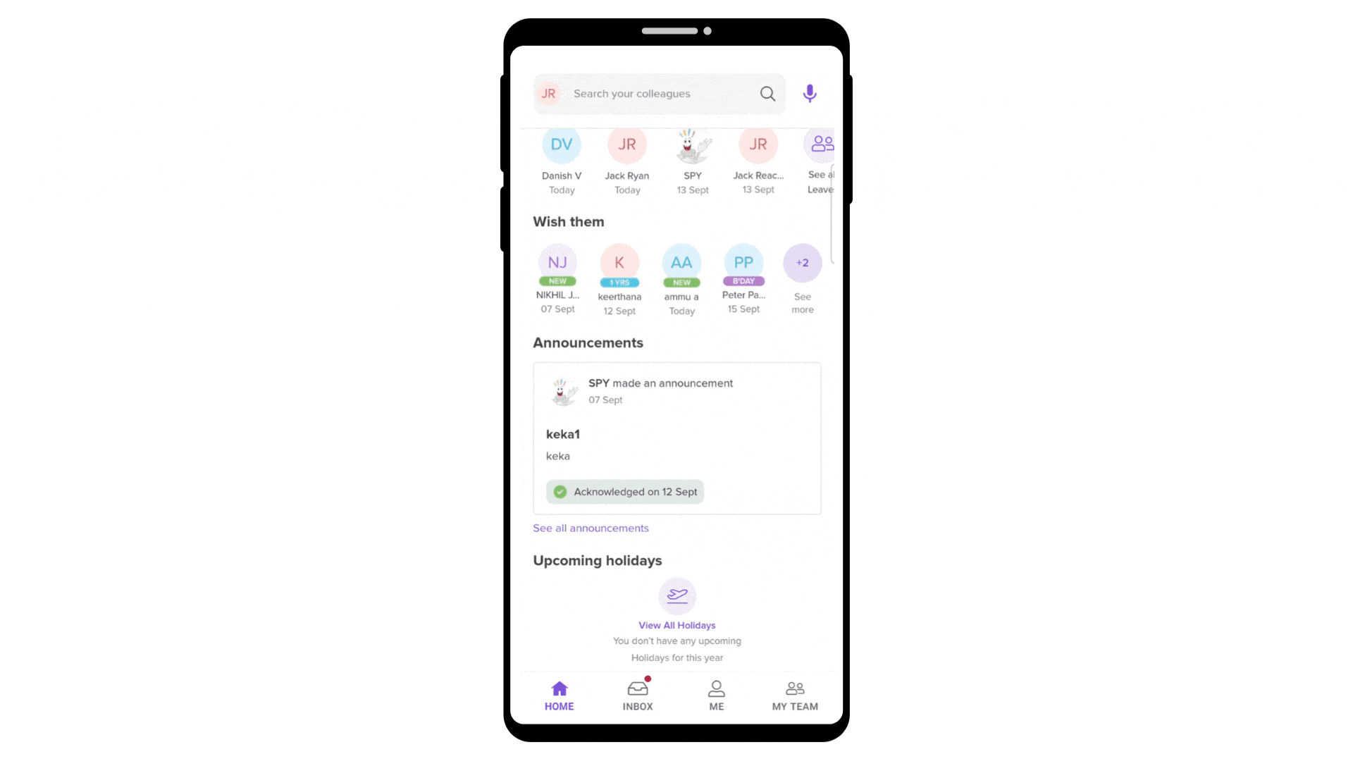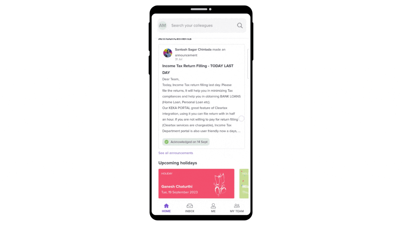 The Keka mobile app homepage is built to consolidate your work tasks, keep you in the loop, and bring ease into your workday. It's your pocket-friendly assistant for all things work-related. So go ahead and start exploring the Keka Mobile App.