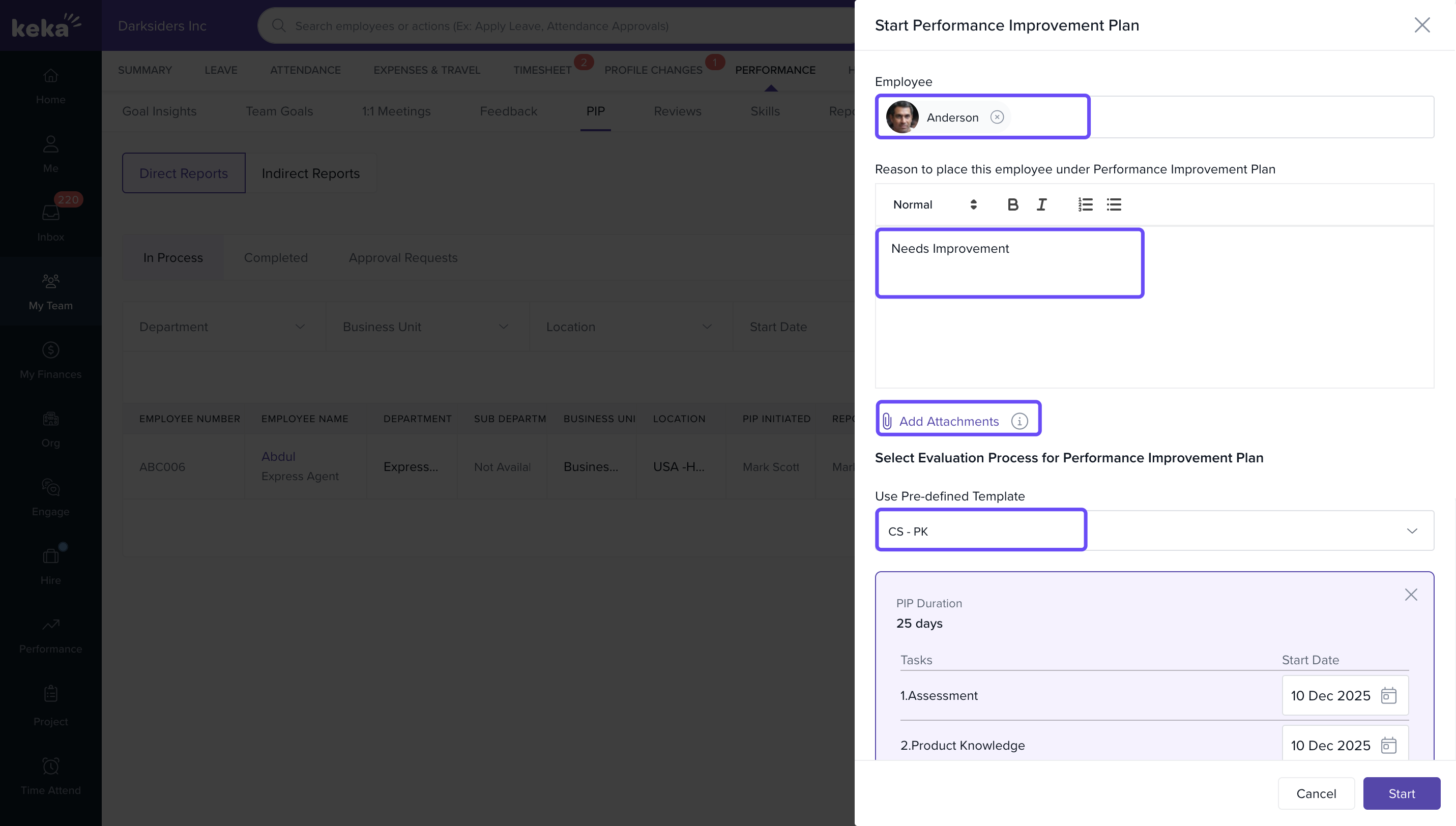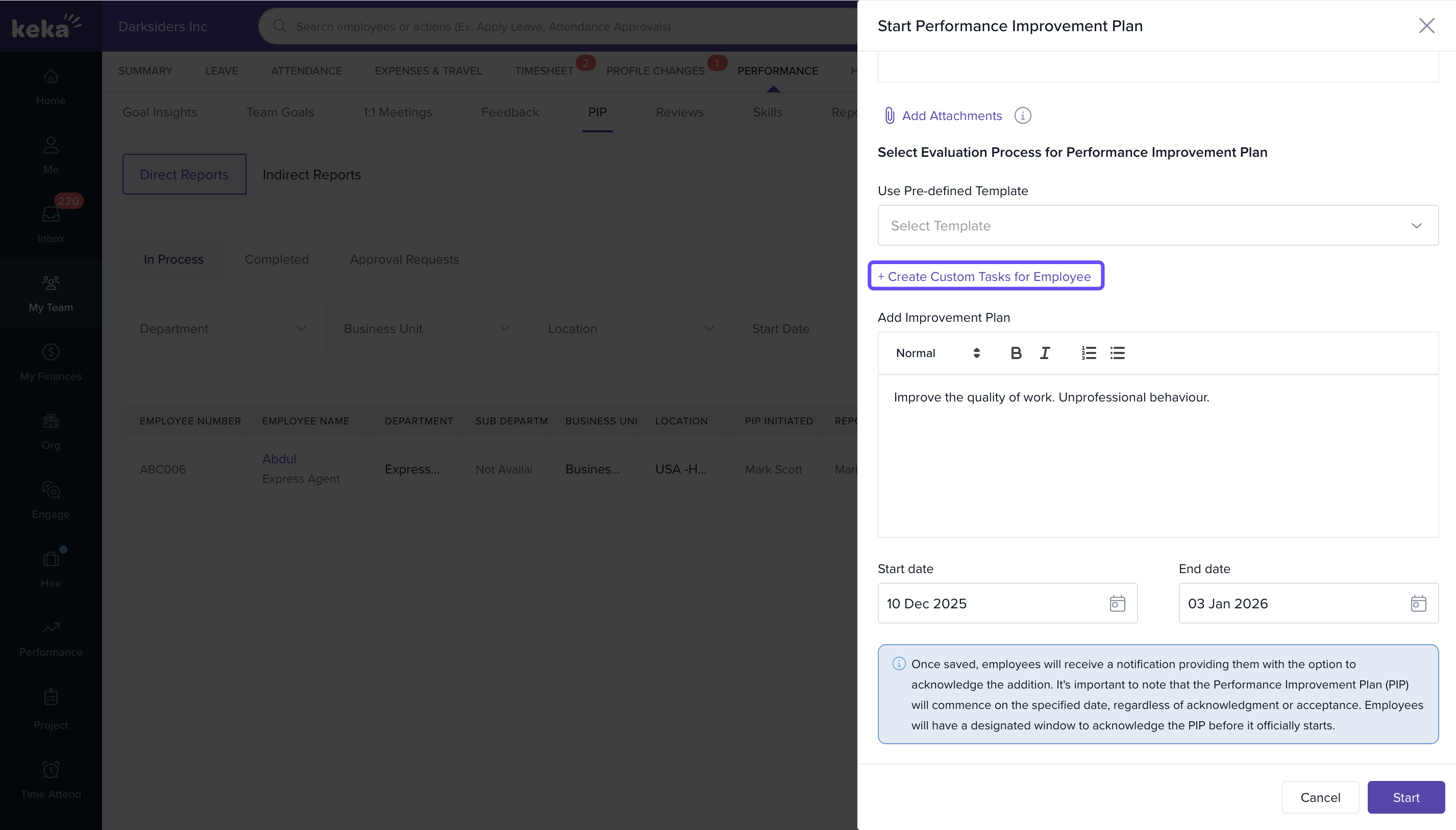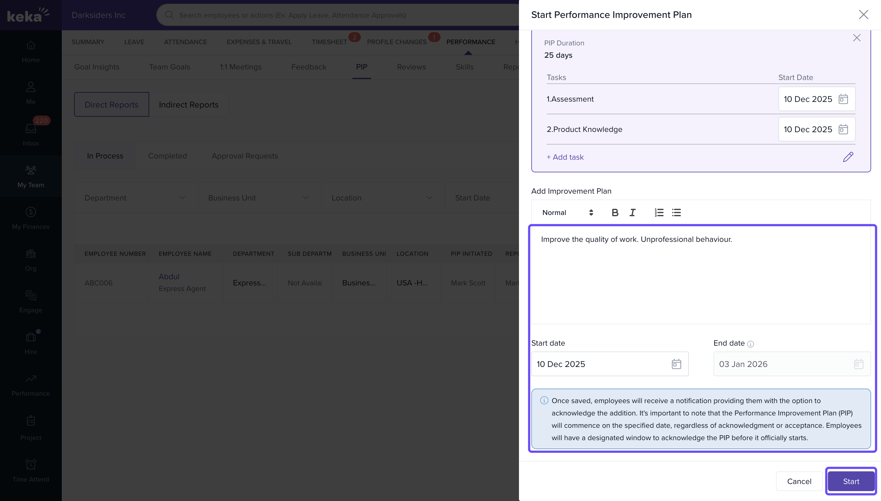 After all fields are completed, click Start to officially initiate the Performance Improvement Plan for the employee.
