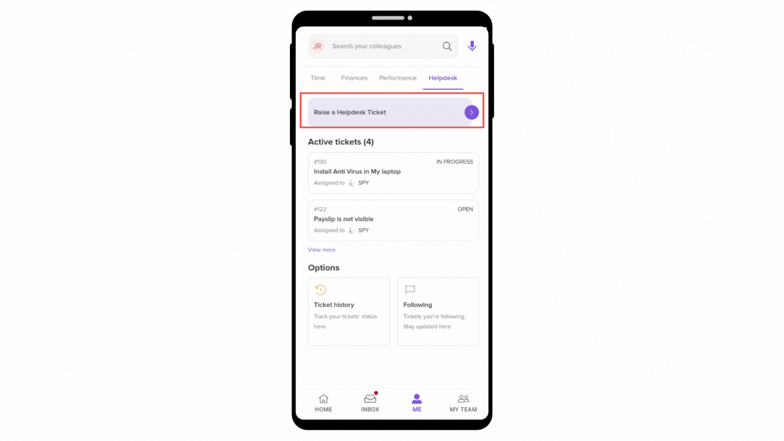 The Helpdesk tab on the Keka app helps you manage and track support requests efficiently. You can view active tickets, check ticket history for past issues, and monitor following tickets to stay updated on concerns you're tracking. It ensures all your support needs are organized and easily accessible.
