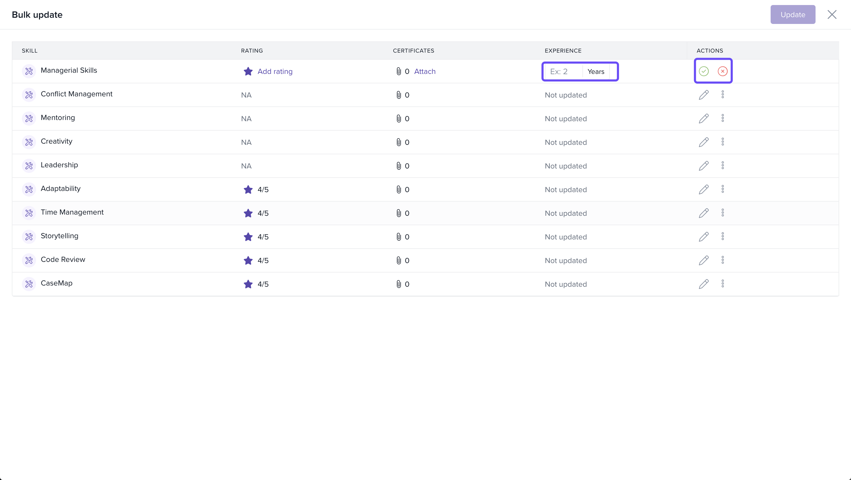 Experience: Update the years of experience the employee has in that skill.