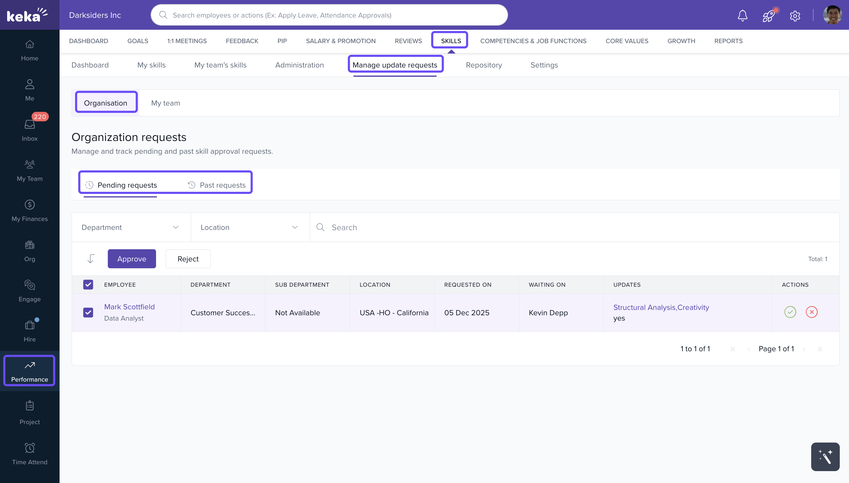 - Go to Performance > Skills > Manage Update Requests. Click Organisation and switch between Pending Approval and Past Requests tabs to manage skill updates: