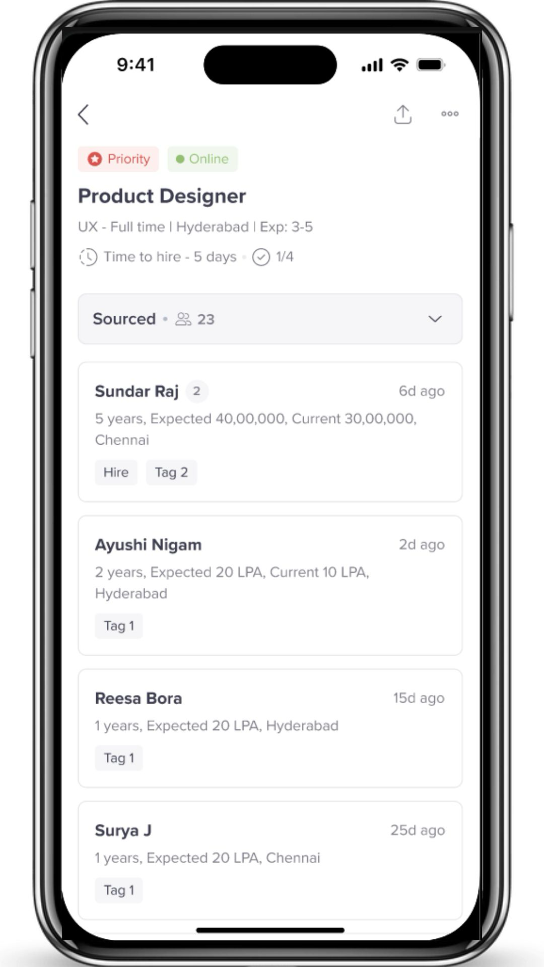 - Clicking on a job opens a detailed screen showing all candidates linked to that job. It lists everything from the candidate's status in the hiring process to specific details like expected salary and experience.