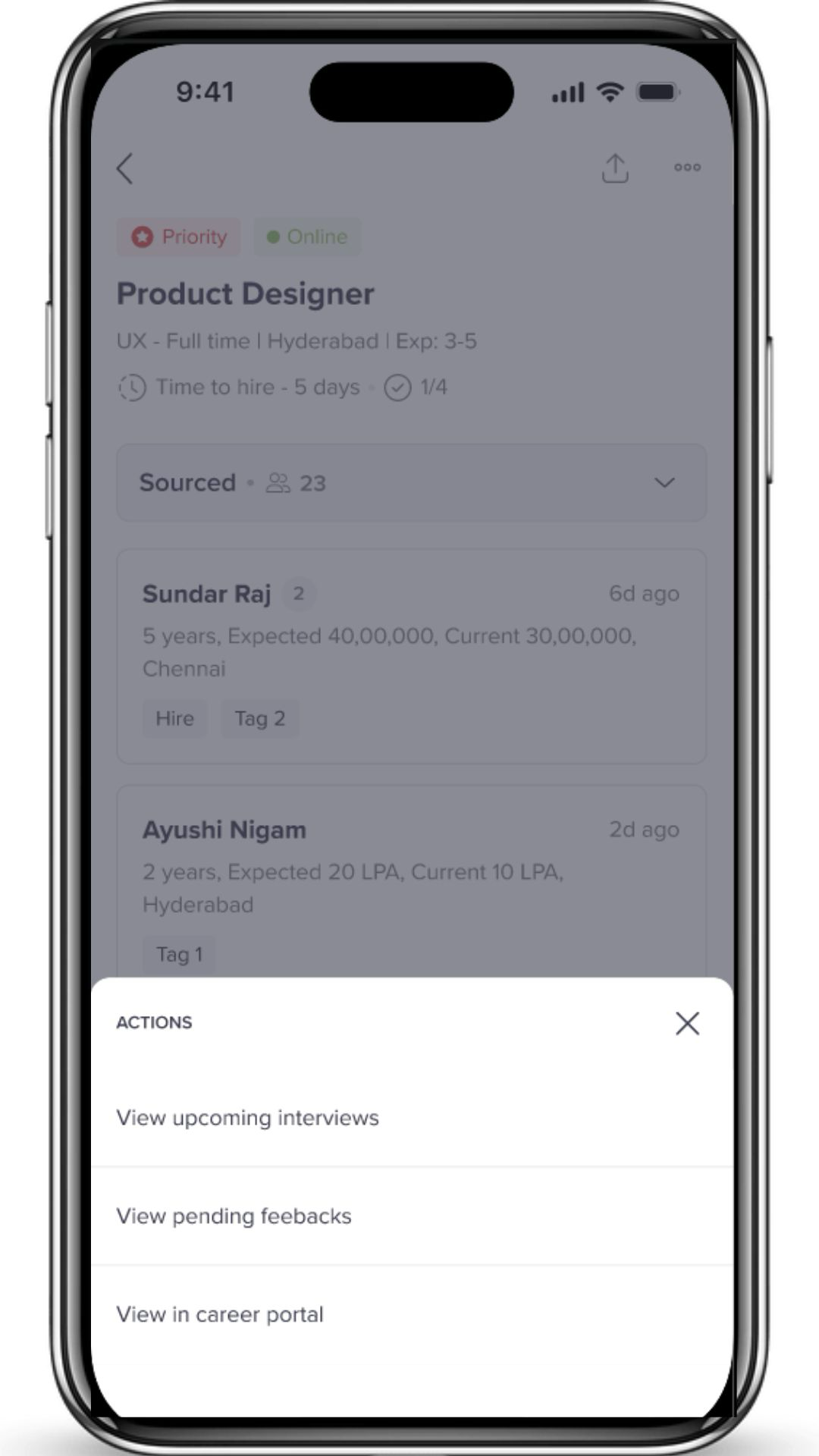 - At the top of the job detail screen, you'll find an icon with three dots. Clicking on this icon provides quick access to view upcoming interviews for the specific job, check pending feedback, and directly navigate to the job posting on the career portal.