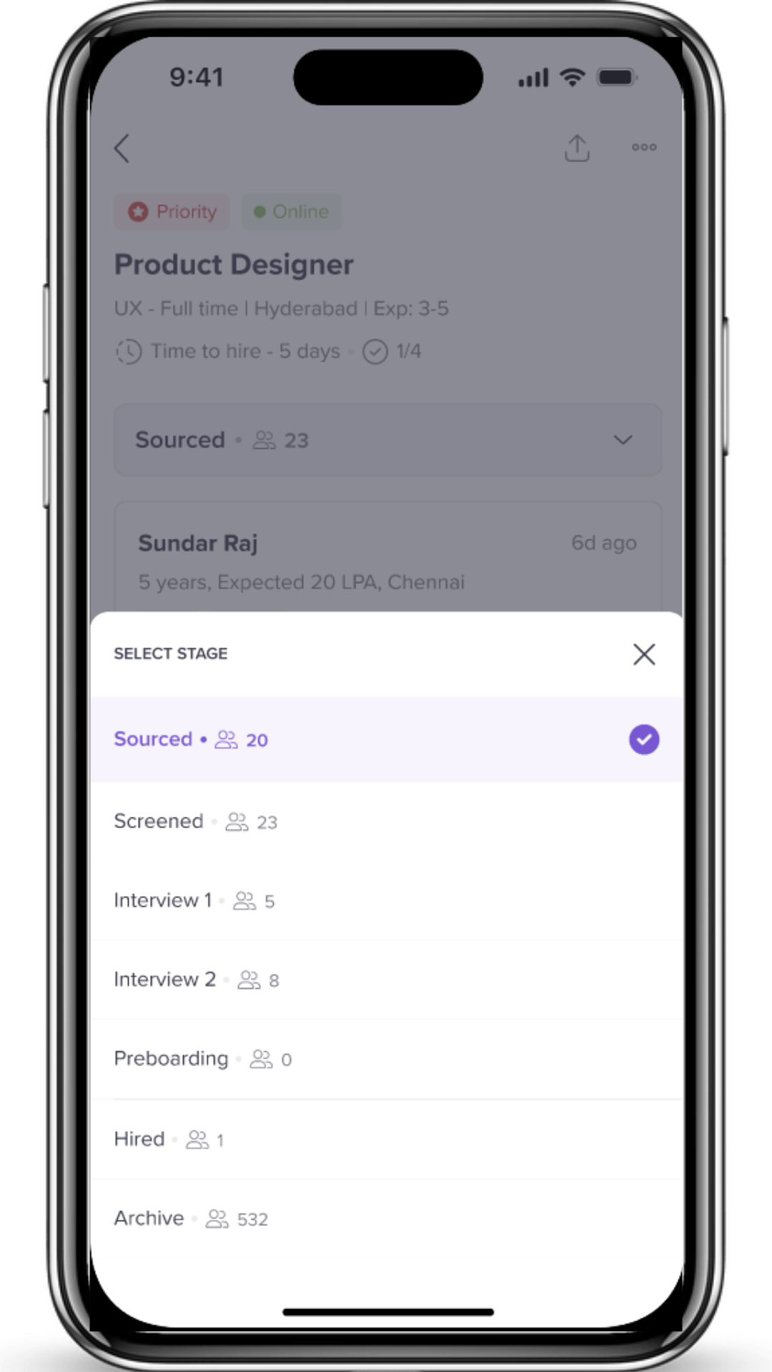 - In the Job details section by touching on job stage, you can view all stages of the job application process and see the number of candidates in each stage.