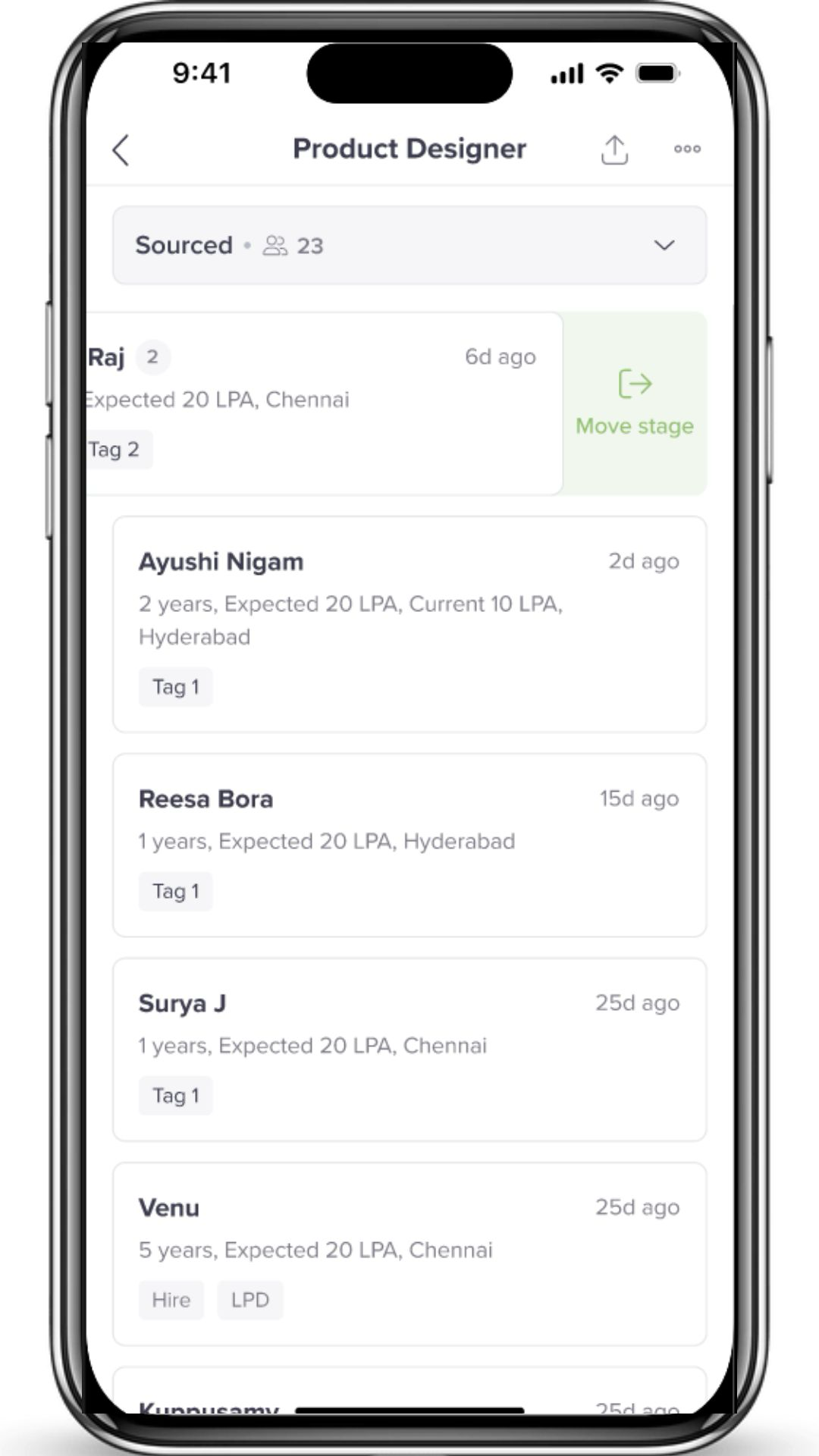 - Swiping left on a candidate’s card reveals quick action Move Stage for progressing an applicant to the next phase